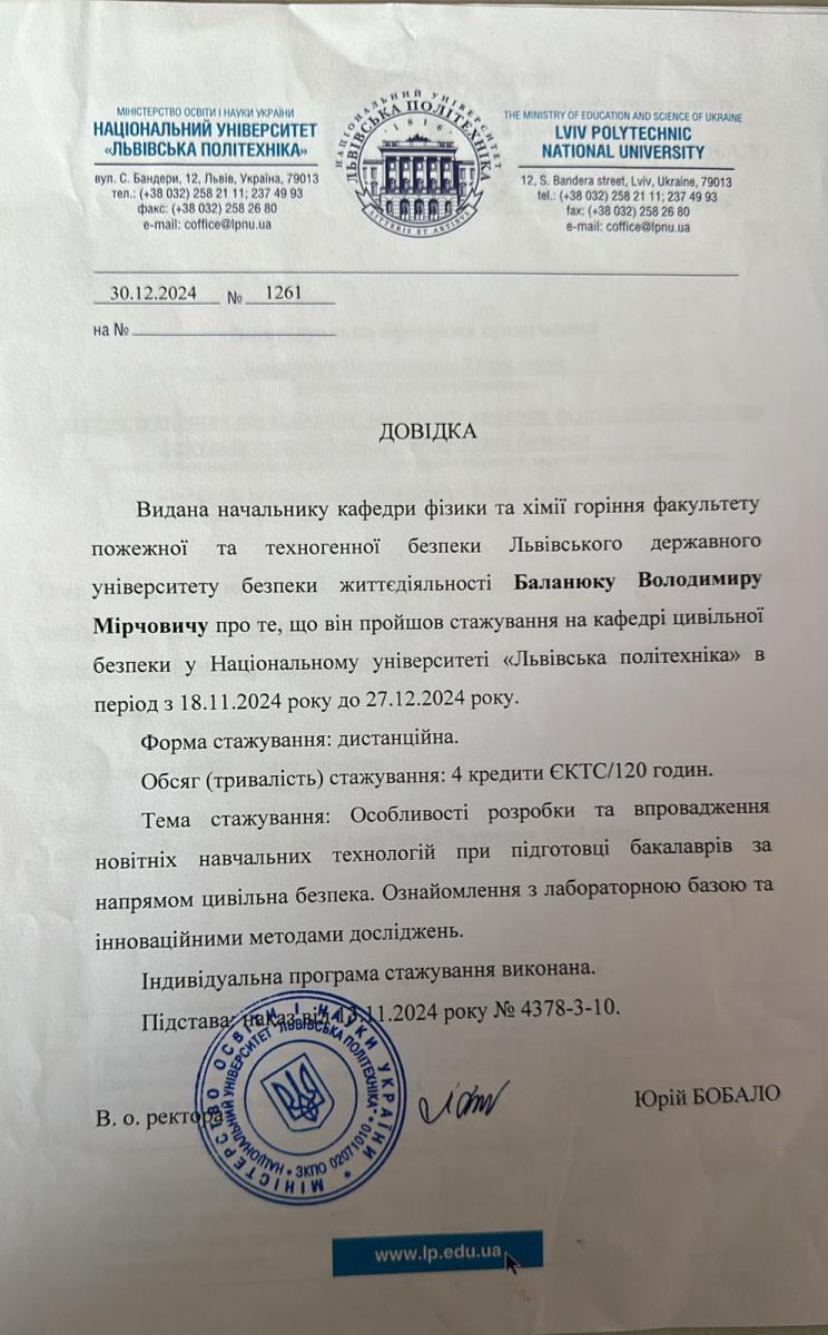 11.02.2019-03.07.2019 доцент кафедри фізики та хімії горіння навчально-наукового інституту пожежної та техногенної безпеки Львівського державного університету безпеки життєдіяльності