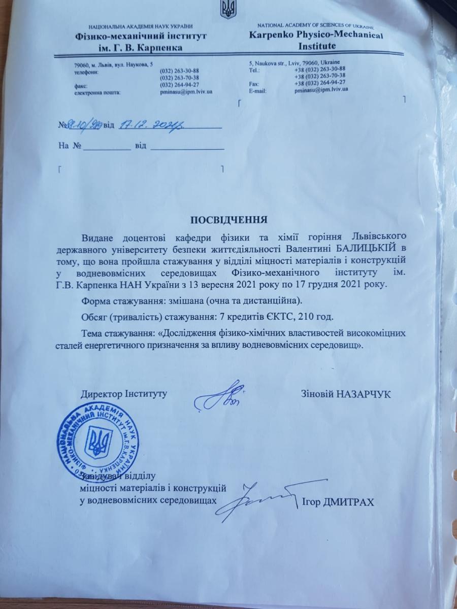 - стажування у "Відділі міцності матеріалів і конструкцій у водневовмісних середовищах" фізико-механічного інституту НАН ім. В. Карпенка (2021 р.);