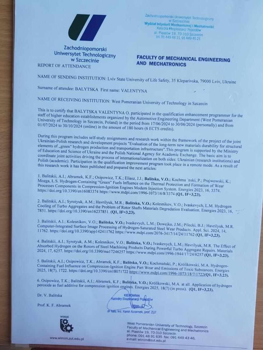 - закордонне наукове стажування в рамках українсько-польського проекту  “Evaluation of long-term  new materials durability for structural elements of “green” hydrogen production and transportation infrastructure” (Західно-поморський технологічний університет, Щецін, Польща, 2024 р.);