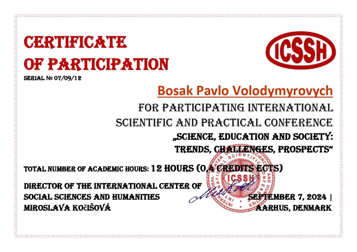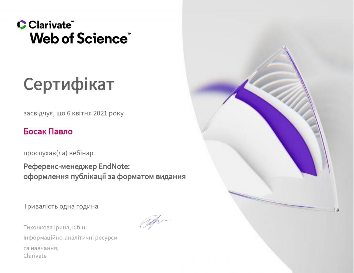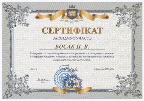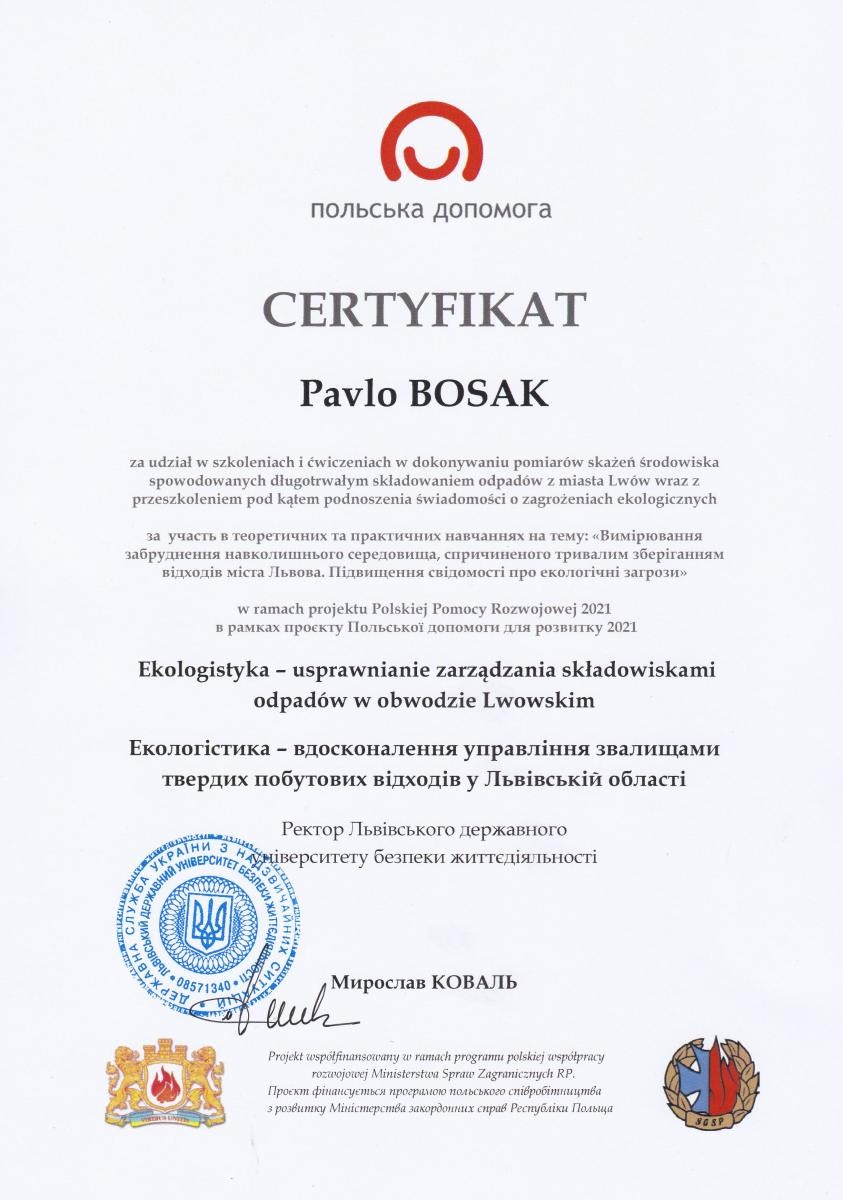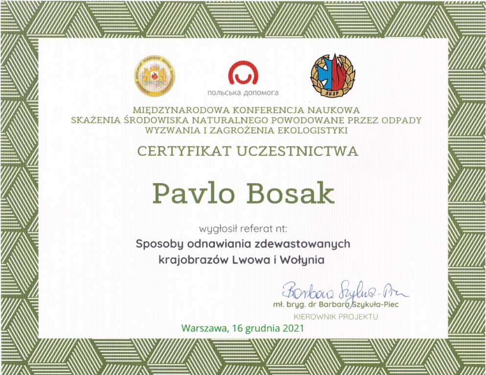 3. Vasyl Popovych, Pavlo Bosak, Mykhailo Petlovanyi, Oksana Telak, Vasyl Karabyn, Volodymyr Pinder (2021). Environmental safety of phytogenic fields formation on coal mines tailings. News of the National academy of sciences of the Republic of Kazakhstan. Series of Geology and Technical Sciences. 2. 446. 129–136. DOI: https://doi.org/10.32014/2021.2518-170X.44 4. Popovych V., Voloshchyshyn A., Bosak P., Popovych N. (2021). Waste heaps in the urban environment as negative factors of urbanization. IOP Conference Series: Earth and Environmental Science 915 (2021) 012001 doi:10.1088/1755-1315/915/1/012001 5. V. M. Skrobala, V. V. Popovych, P. V. Bosak, T. I. Shuplat (2022). Prediction of changes in the vegetation cover of Ukraine due to climate warming. Naukovyi Visnyk Natsionalnoho Hirnychoho Universytetu (4), 96–105 https://doi.org/10.33271/nvngu/2022-4/096 6. Bosak P., Lukianchuk N., Pinder V., Shukel I., Popovych V. (2023). Performance analysis of protective functions of forest plantations of the Lviv railway line (Ukraine). Ecological Questions, 34(3). 1–18. https://doi.org/10.12775/EQ.2023.031 7. P. V.Bosak, N. H.Lukianchuk, M.M.Nazaruk, V. V.Popovych, V. S.Kucheryavyy (2023). Radionuclide content in vegetation and soils in the impact zone of the railway track. Naukovyi Visnyk Natsionalnoho Hirnychoho Universytetu (5). 108–113 https://doi.org/10.33271/nvngu/2023-5/108 8. Popovych V., Skyba, T., Koval V., Bosa, P., Kopystynskyi Y. (2024). Ecological Successions of Urban Landfills of the Western Forest Steppe of Ukraine. Ecological Engineering & Environmental Technology, 25(7), 225-233. https://doi.org/10.12912/27197050/188601 9. Босак П. В., Стокалюк О. В., Корольова О. Г., Попович В. В. (2020). Управління екологічною безпекою у проектах розвитку гірничопромислових комплексів. Вісник Львівського державного університету безпеки життєдіяльності. 22. 5–11. https://doi.org/10.32447/20784643.22.2020.01. 10. Босак П. В., Попович В. В., Піндер В. Ф., Стокалюк О. В. (2020). Температура займання та самозаймання найпоширеніших деревних порід териконів. Науковий вісник НЛТУ України. 30, 5. 53–58 https://doi.org/10.36930/40300509. 11. Босак П. В., Попович В. В. (2020). Еко-геоінформаційна технологія захисту довкілля від підтериконових вод Нововолинського гірничопромислового району. Науково-практичний журнал Екологічні науки. 4 (31). 96–102. https://doi.org/10.32846/2306-9716/2020.eco.4-31.14. 12. Босак П. В., Попович Н. П., Попович В. В. (2020). Моніторинг надзвичайних ситуацій Львівської області, пов’язаних із пожежами на об’єктах із складуванням відходів. Науковий вiсник: Цивiльний захист та пожежна безпека. 2(10). 32–38. https//doi.org/10.33269/nvcz.2020.2.32-38. 13. Босак П. В. (2021). Підвищення екологічної безпеки в лісах України. Науково-практичний журнал Екологічні науки. 4 (37). 98–101. https://doi.org/10.32846/2306-9716/2021.eco.4-37.14 14. Босак П. В., Попович В. В., Попович Н. П. (2021). Моніторинг надзвичайних ситуацій Львівської області, пов’язаних із пожежами на об’єктах із складуванням відходів. Науковий вiсник Цивiльний захист та пожежна безпека. 2 (10). 32–38 https://doi.org/10.33269/nvcz.2020.2.32-38 15. Босак П.В., Лук’янчук Н.Г., Попович В.В. (2022). Чинники впливу залізничного транспорту на екологічну безпеку довкілля. Науково-практичний журнал "Екологічні науки" № 3(42). 205–210 https://doi.org/10.32846/2306-9716/2022.eco.3-42.34 16. Босак П.В., Стокалюк О.В. (2022). Моделювання поширення забруднюючих речовин у довкілля з породних відвалів вугільних шахт Нововолинського гірничопромислового району. Вісник Львівського державного університету безпеки життєдіяльності № 26. 5–13 DOI:10.32447/20784643.26.2022.01 17. Попович В.В., Босак П.В. Пожежі у природних екосистемах. Курс лекцій: навчальний посібник / В. В. Попович, П. В. Босак. Львів: Львівський державний університет безпеки життєдіяльності, 2021. 322 с. 18. Босак П. В. Екологічна небезпека підтериконових стічних вод Нововолинського гірничопромислового району EcoLab. Том 1 : монографія/ П. В. Босак, В. В. Попович. Львів: ЛДУ БЖД, 2022. 231 с. 19. Піндер В. Ф. Рекультиваційні заходи зниження техногенного впливу породних відвалів вугільних шахт на довкілля EcoLab. Том 2 : монографія/ В. Ф. Піндер, В. В. Попович, П. В. Босак. Львів: ЛДУ БЖД, 2023. 245 с. 20. Волощишин А.І. Екологічний с
