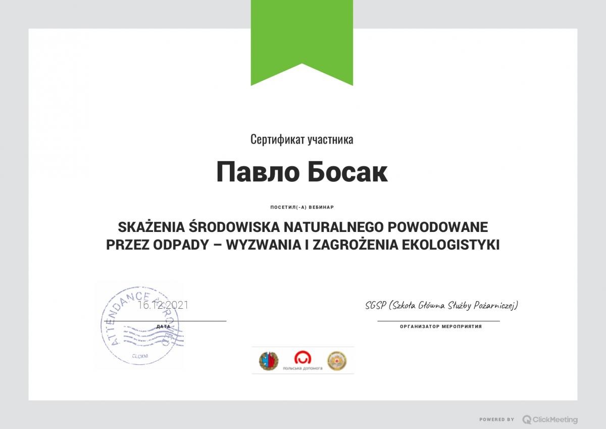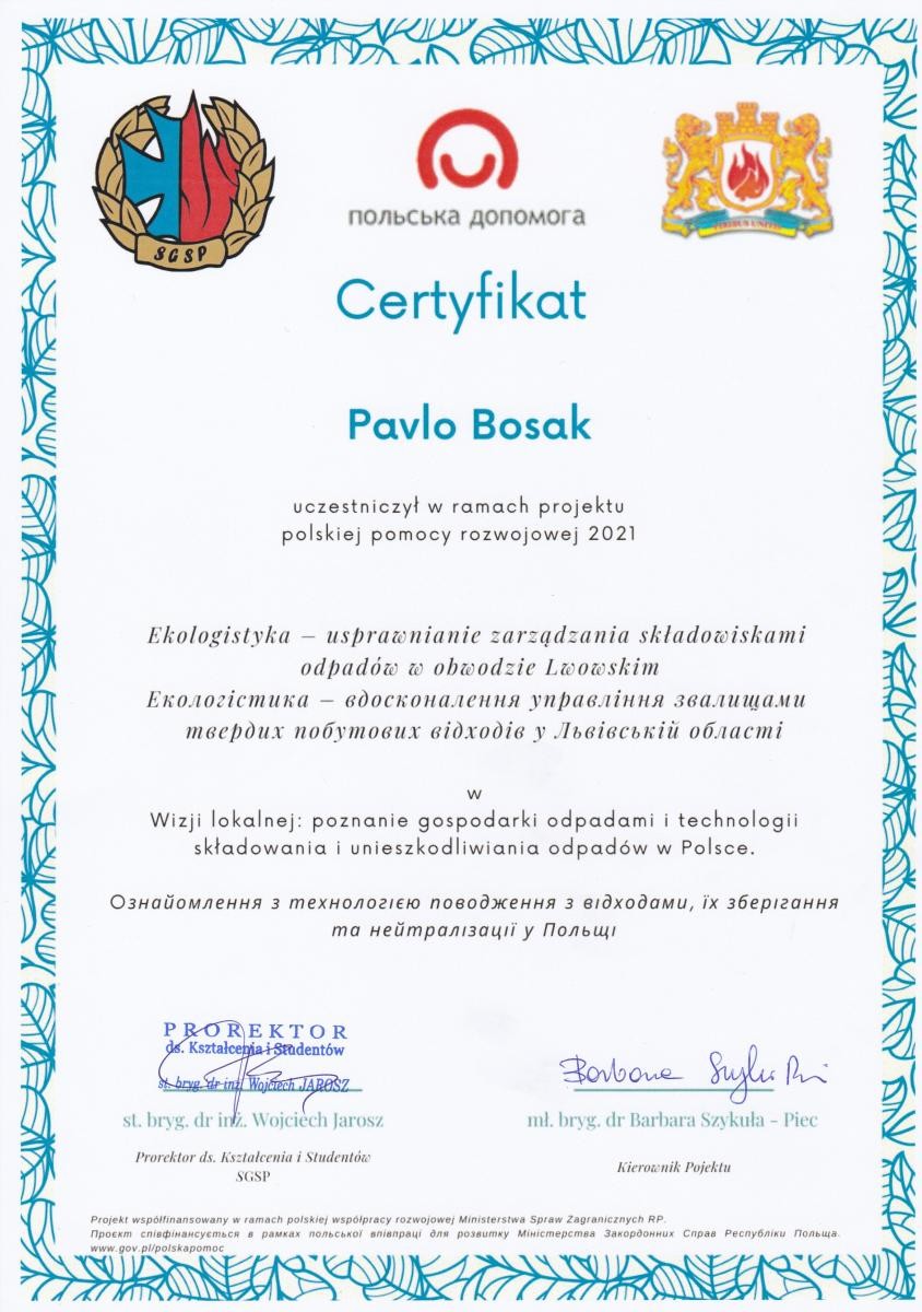 У 2021 році взяв участь у міжнародному проєкті «Екологістика – вдосконалення управління звалищами твердих побутових відходів у Львівській області», який реалізований Львівським державним університетом безпеки життєдіяльності та Головною школою державної пожежної служби в місті Варшава за підтримки Програми «Польська допомога», яка реалізується під егідою Міністерства закордонних справ Республіки Польща (м. Львів, Україна, м. Варшава, Республіка Польща).