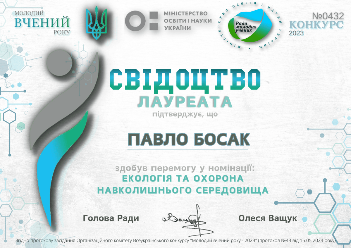 Лауреат в номінації «Екологія та охорона навколишнього середовища» щорічного Всеукраїнського конкурсу «Молодий вчений 2023 року» Ради молодих учених при Міністерстві освіти та науки України.