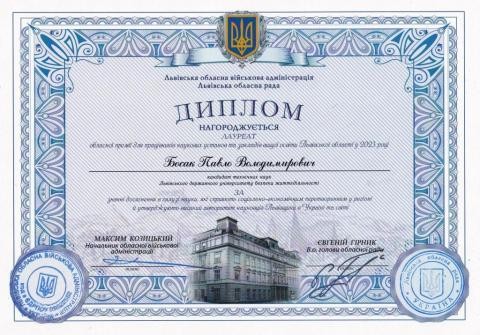 Лауреат обласної премії для працівників наукових установ та закладів вищої освіти Львівської області у 2023 році за значні досягнення в галузі науки, які сприяють соціально-економічним перетворенням у регіоні й утверджують високий авторитет науковців Львівщини в Україні та світі.