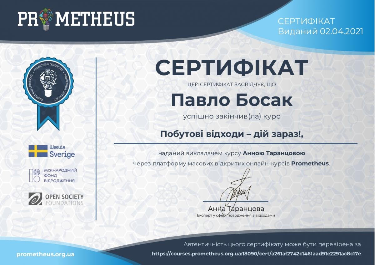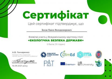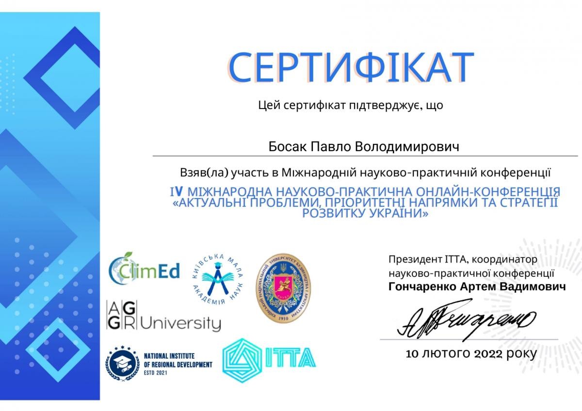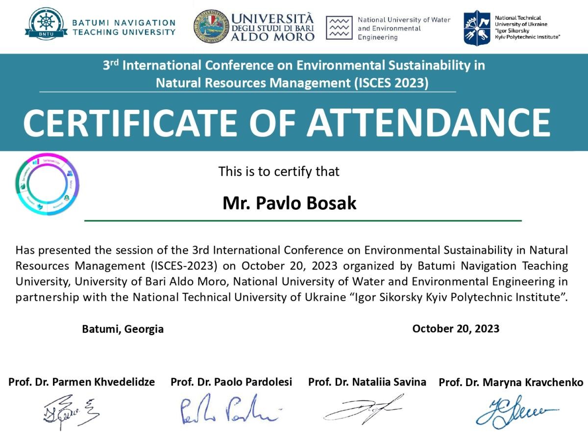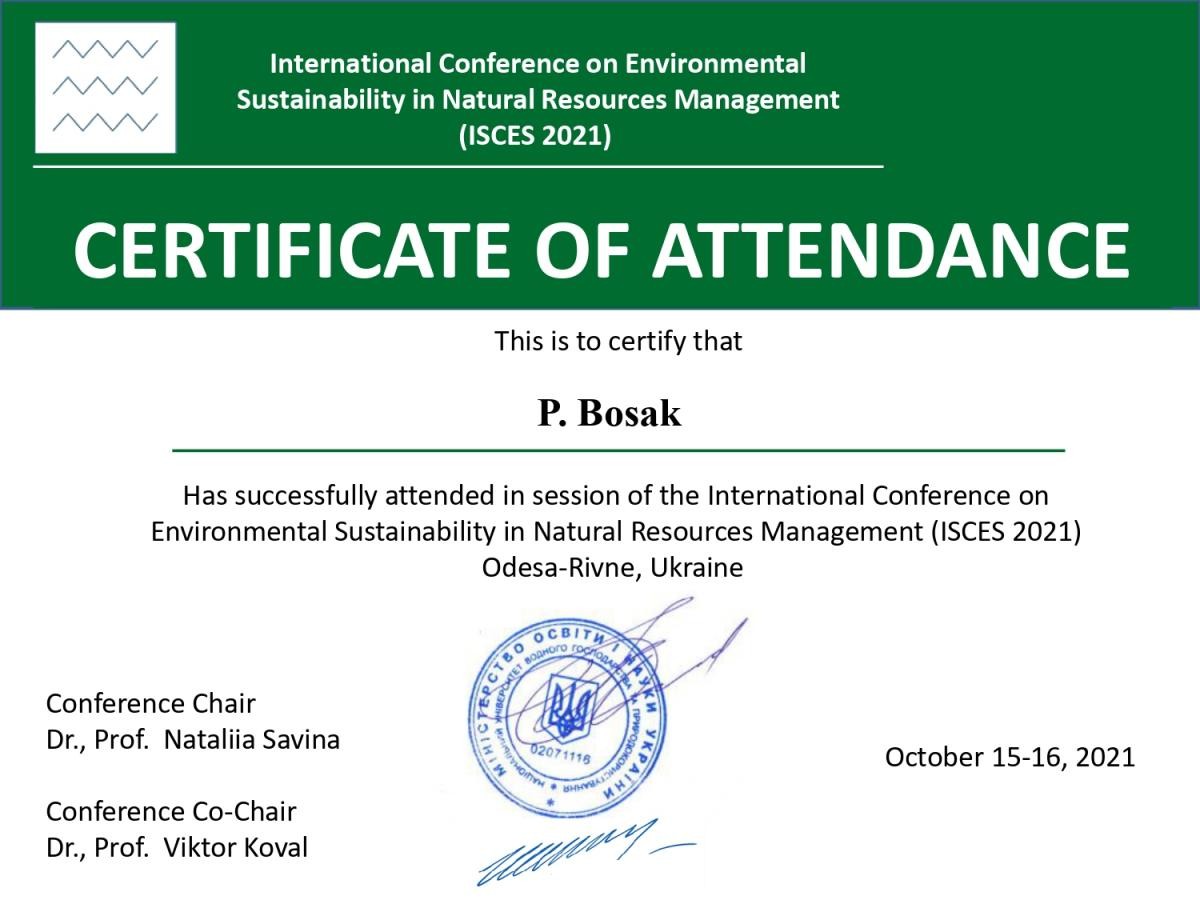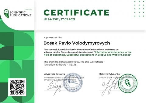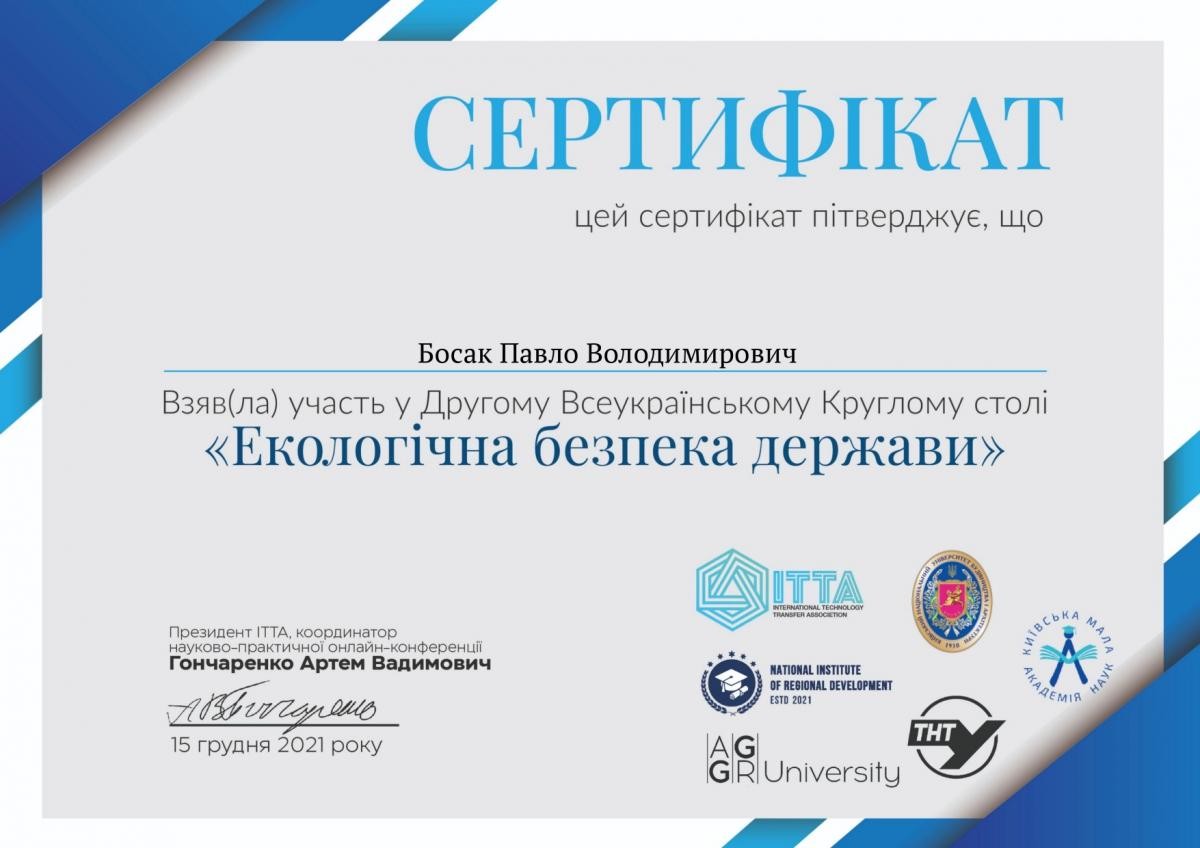1. У 2019 року проходив стажування в Інституті сталого розвитку ім. В.Чорновола НУ "Львівська Політехніка" з 28.10. по 30.12.2019 року. Наказ НУ