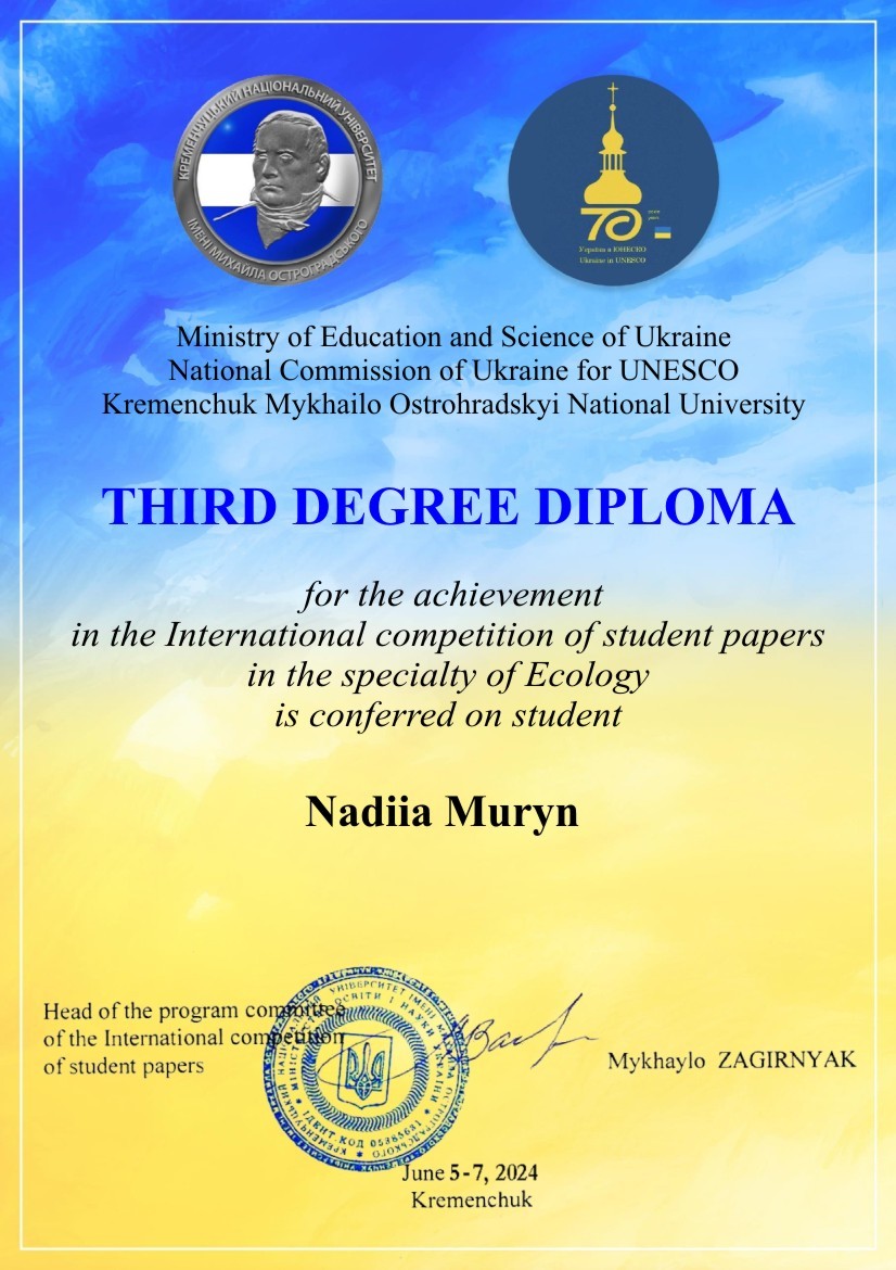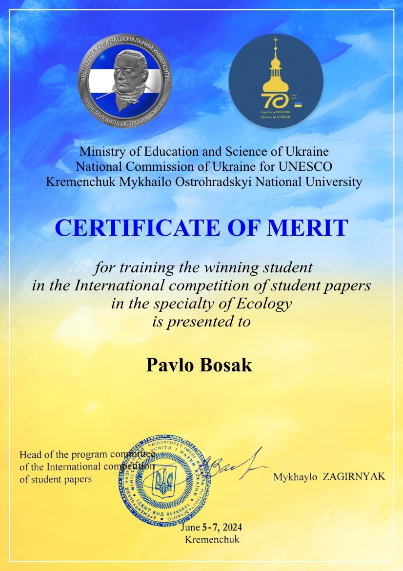 2. Кувік С. В. «Антропогенний вплив на екологічний стан поверхневих і підземних вод річки Тиса». Переможець І-го туру Всеукраїнського конкурсу студентських наукових робіт 2021/2022 н.р. (Диплом переможця І туру, 2022 р.). 3. Бироваш Я. М. «Вплив вирубку деревних порід лісового масиву на довкілля (Закарпатська область)». Переможець І-го туру Всеукраїнського конкурсу студентських наукових робіт 2021/2022 н.р. (Диплом переможця І туру, 2022 р.). 4. Мурин Н.Є. «Дослідження гідромереж та їх вплив на довкілля у м. Яворів Львівської області». Переможець ІІ туру Міжнародного конкурсу студентських наукових робіт-2024 року зі спеціальності 101 «Екологія» (Диплом ІІІ ступеня, 2024 р.). Участь у наукових та навчальних проєктах: