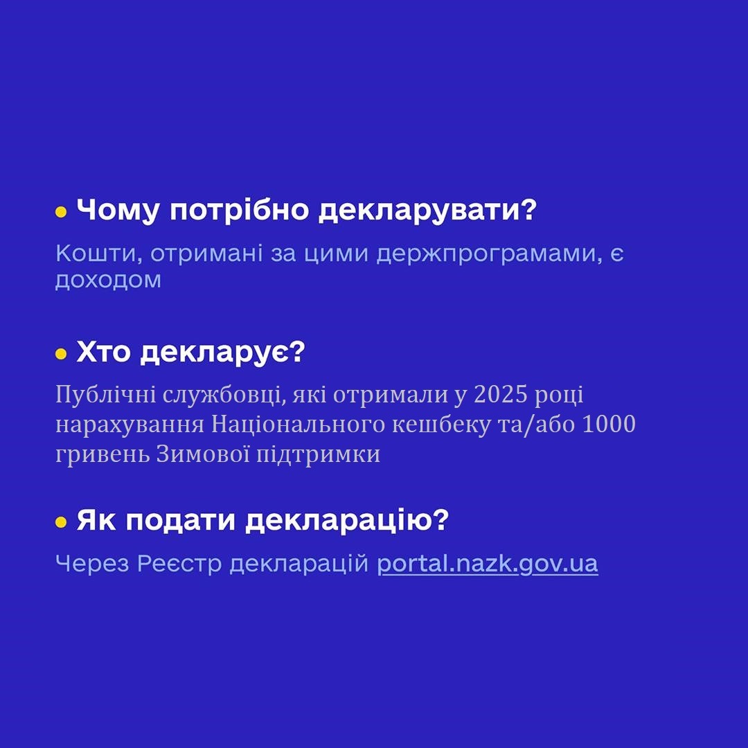 Публічні службовці, які отримали у 2025 році нарахування Національного кешбеку та/або Зимової єПідтримки, мають їх задекларувати.