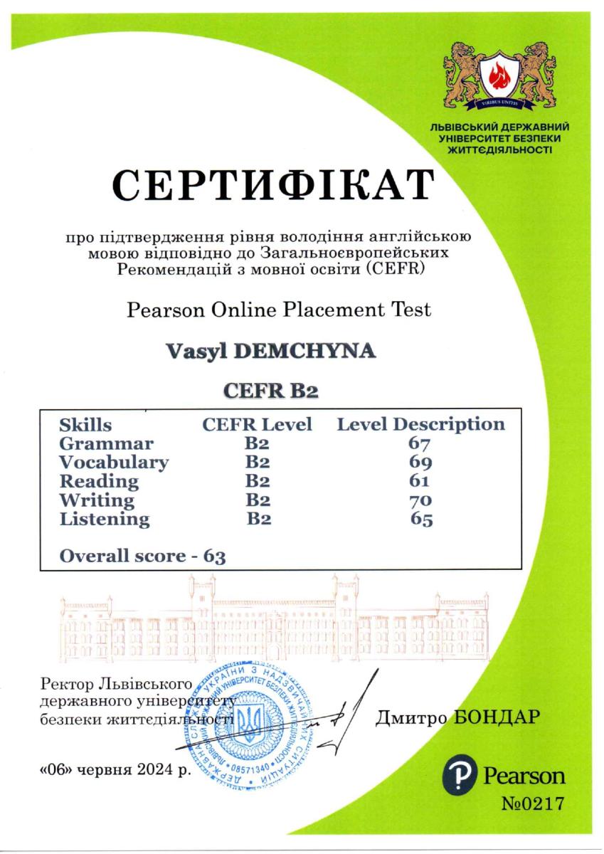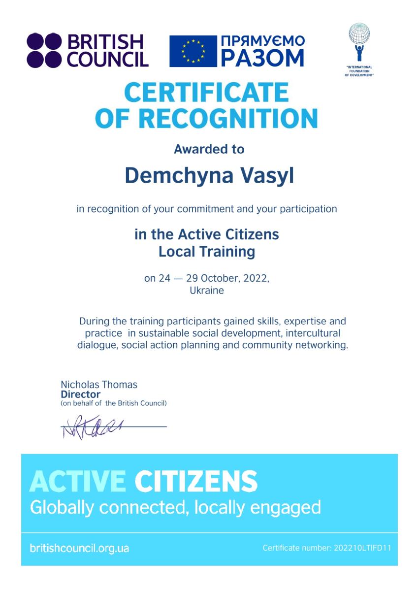 Я, Демчина Василь Романович народився 26 березня 1998 року в с. Жовтанці, Львівського р-н. З вересня 2004 року до травня 2015 року навчався у ЗОШ І-ІІІ ст. с. Жовтанці, де одержав атестат про повну середню освіту.
