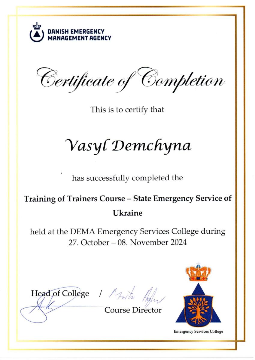 У 2024 році брав участь у міжнародних тренінгах організованих Датським агентством з управління надзвичайними ситуаціями в рамках проєкту «Підтримка України 2024», які відбувались на базі «DEMA», м. Тінглев, (Королівство Данія).