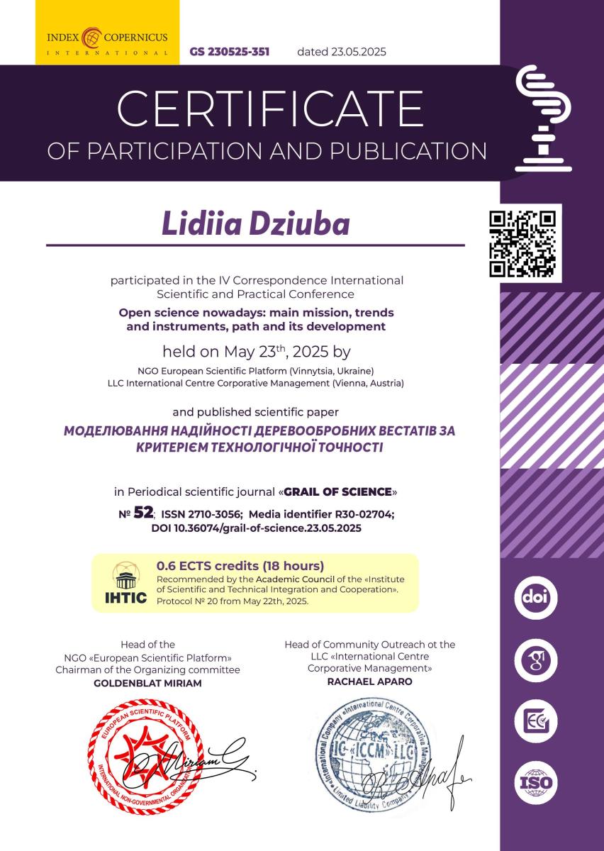 2. Ребезнюк І. Т. Дослідження напружено-деформованого стану розведених зубів стрічкової пилки / І. Т. Ребезнюк, Л. Ф. Дзюба // Машинознавство. Всеукр. наук.-техн. і вироб. журн. – Львів, 2005. – №9. – С. 27–29. 3. Ольховий І. М. Про оцінку контактної витривалості зубців закритих передач машин і пристроїв пожежогасіння/ І. М. Ольховий, Л. Ф. Дзюба, Х. І. Ліщинська // Зб. наук. праць ЛДУ БЖД «Пожежна безпека». – Львів : ЛДУ БЖД, 2007. – №10. – С. 65–70. 4. Ребезнюк І. Т. Динамічне моделювання сили різання деревини на горизонтальному стрічкопилковому верстаті / І. Т. Ребезнюк, Л. Ф. Дзюба, О. В. Меньшикова // Вісник НУ «Львівська політехніка» «Динаміка, міцність та проектування машин і приладів». – Львів : НУ «Львівська політехніка», 2008. – №614. – С. 116–120. 5. Ребезнюк І. Т. Динамічне навантаження стрічкової пилки / І. Т. Ребезнюк, Л. Ф. Дзюба // Вісник СевНТУ. Вип. 88: Механіка, енергетика, екологія: зб. наук. пр. – Севастоп. нац. техн. ун-т. – Севастополь: Вид-во СевНТУ, 2008. – № 88. –С. 18–21. 6. Дзюба Л. Дослідження динамічної стійкості стрічкової пилки / Л. Дзюба, І. Ребезнюк, О. Меньшикова, А. Пилип’як // Машинознавство. Всеукр. наук.-техн. і вироб. журн. – Львів, 2009. – № 6. – С 34–38. 7. Ребезнюк І. Т. Моделювання поздовжніх коливань полотна стрічкової пилки / І. Т. Ребезнюк, Л. Ф. Дзюба, О. В. Меньшикова // Вісник СевНТУ. Вип.110: Механіка, енергетика, екологія: зб. наук. пр. – Севастоп. нац. техн. ун-т. – Севастополь : Вид-во СевНТУ, 2010. – №110 – С. 157–159. 8. Ребезнюк І. Т. Початкові положення аналітичного дослідження динаміки процесу розпилювання деревини на горизонтальному стрічкопилковому верстаті/ І. Т. Ребезнюк, Л. Ф. Дзюба, А. Б. Пилип’як // Наук. вісник НЛТУ України : зб. наук.-техн. праць. – Львів: РВВ НЛТУ України, 2010. – Вип. 20.4. – С. 273–276. 9. Дзюба Л. Ф. Cила натягу у вітках стрічкової пилки під час різання деревини / Л. Ф. Дзюба, О. В. Меньшикова, І. Т. Ребезнюк // Науковий вісник НЛТУ України: зб. наук.-техн. праць. – Львів: РВВ НЛТУ України, 2011. – Вип. 21.7 – С. 89–95. 10. Пилип’як А. Б. Методика експериментального дослідження напруження у вузькій стрічковій пилці під час різання деревини / А. Б. Пилип’як, Л. Ф. Дзюба, І. Т. Ребезнюк // Науковий вісник НЛТУ України : зб. наук.-техн. праць. – Львів: НЛТУ України, 2011. – Вип. 21.17. – С. 151–154. 11. Дзюба Л. Ф. Теоретичне дослідження контактних напружень у зоні контакту полотна пилки з напрямним роликом з урахуванням сили тертя. / Л. Ф. Дзюба, І. М. Ольховий, І. Т. Ребезнюк // Науковий вісник НЛТУ України : зб. наук.-техн. праць. – Львів : РВВ НЛТУ України, 2011. – Вип. 21.12. – С. 132–136. 12. Дзюба Л. Ф. Оцінка втомної мiцностi стрічкових пилок різних марок / Л. Ф. Дзюба, І. Т. Ребезнюк, О. В. Меньшикова // Вісник СевНТУ. Вип.120: Механіка, енергетика, екологія : зб. наук. пр. – Севастоп. нац. техн. ун-т. – Севастополь: Вид-во СевНТУ, 2011.– Севастополь, 2011. – С. 224 – 227. 13. Дзюба Л. Ф. Оцінка запасу міцності вузьких стрічкових пилок / Л. Ф. Дзюба, І. Т. Ребезнюк, А. Б. Пилип’як // Машинознавство: всеукр. щомісяч. наук.-техн. і вироб. журн. – Львів, 2012. – № 3–4. – С. 42–44. 14. Дзюба Л. Ф. Теоретичне дослідження контактних напружень в зоні контакту полотна стрічкової пилки з напрямним роликом / Л. Ф. Дзюба, І. М. Ольховий, І. Т. Ребезнюк // Сільськогосподарські машини: зб. наук. ст. – Луцьк : Ред.-вид. відділ ЛНТУ, 2012. – Вип. 22. – С. 57–64. 15. Пилип’як А. Б. Експериментальне дослідження зміни напруження у вузькій стрічковій пилці під час пиляння деревини / А. Б. Пил
