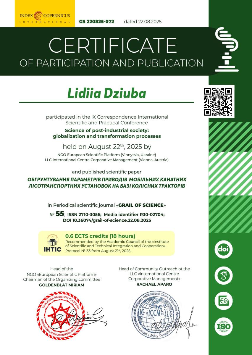 2. Гуліда Е.М., Дзюба Л.Ф., Ольховий І.М. Прикладна механіка. Підручник для студентів вищих навчальних закладів.Підручник рекомендований МОіН Украіни. - Львів, «Світ», 2006. - 384 с. 3. Гуліда Е.М., Ольховий І.М., Дзюба Л.Ф.,Збірник задач з прикладної механіки. Навчальний посібник рекомендований МОіН Украіни. Видавництво ЛДУБЖД, - Львів : ЛДУ БЖД, 2011. - 306 с. 4. Ольховий І. М., Дзюба Л. Ф., Гуліда Е. М. Розрахунок і проектування механічних передач привода технологічної машини. Навчальний посібник.Рекомендовано до видання Вченою радою ЛДУБЖД.- Львів: ЛДУ БЖД, 2013. - 156 с. 5. Дзюба Л. Ф., Меньшикова О. В., Кусій М. І. Надійність технічних систем і техногенний ризик. Навчальний посібник. Рекомендовано до видання Вченою радою ЛДУ БЖД. - Львів: ЛДУ БЖД, 2018 - 144 с. 6. Штанько П. К., Шевченко В. Г., Омельченко О.С., Дзюба Л. Ф. Пасіка В.Р., Поляков О. М. Теоретична механіка. Навчальний посібник.Запоріжжя, НУ «Запорізька політехніка», 2021. – 464 с. Наукове стажування