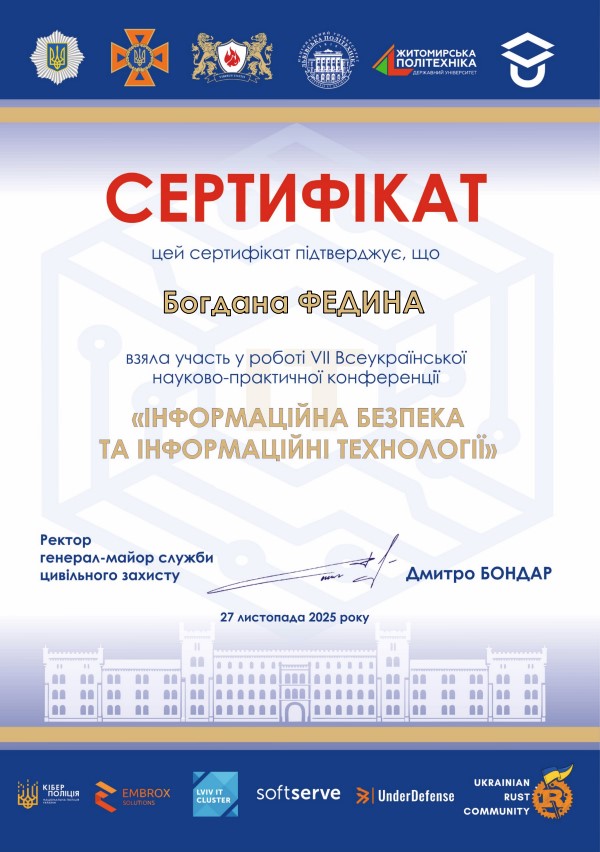 7. Федина Б. І., Лисий Ю. М., Сидоренко Р. В. Інформаційні технології створення сценаріїв діалогу для управління в ієрархії АСУ-ТП інфраструктури // Інформаційна безпека та інформаційні технології, ІБІТ 2024 : збірник доповідей V Міжнародної науково-практичної конференції, м. Львів, 27 листопада 2024 року. – 2024. – C. 499–505.