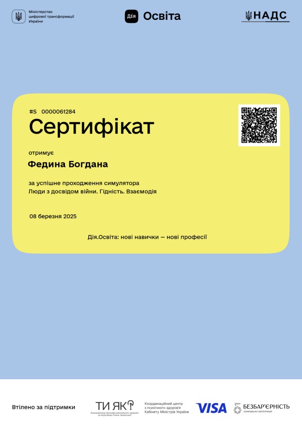 3. Summer School «Digital education for teachers: Augmented reality for Education» in context of Jean Monnet Module 101085772-AR4EDU-ERASMUS-JMO-2022-HEI-TCH-RSCH «Augmented Reality for Education: implementation of European experience»/ AR4EDU which was conducted at Lviv Polytechnic Nacional University, Lviv, Ukraine, June 17 – June 21, 2024. Certificane of Participation № 2024-1-30 (40 годин)