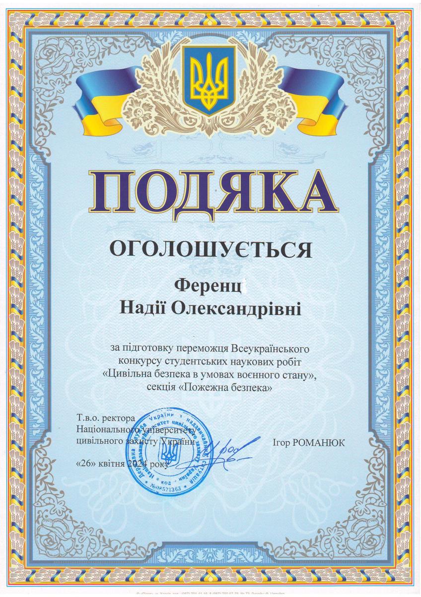 ·   Исследование условий возгорания отделочных материалов от электрических проводников нагретых током/Гудым В.И., Ференц Н.О., Назаровец О.Б.//Вестник Кокшетауского технического института Комитета по чрезвычайным ситуациям МВД Республики Казахстан №1(17) – К.: КТИ КЧС МВД РК, 2015. – С. 37–44. Ференц Н.О., Вовк С.Я., · · Керод І.Б., Артеменко В.В. Дослідження можливості евакуації з виробничого цеху паперової фабрики. Вісник Львівського національного університету природокористування. Серія «Архітектура та будівництво». 2022. № 23.  - С. 76-83.