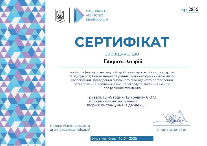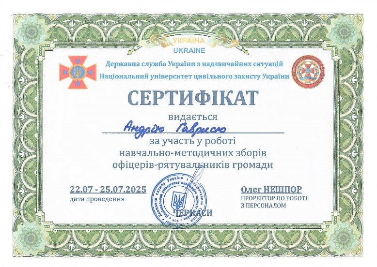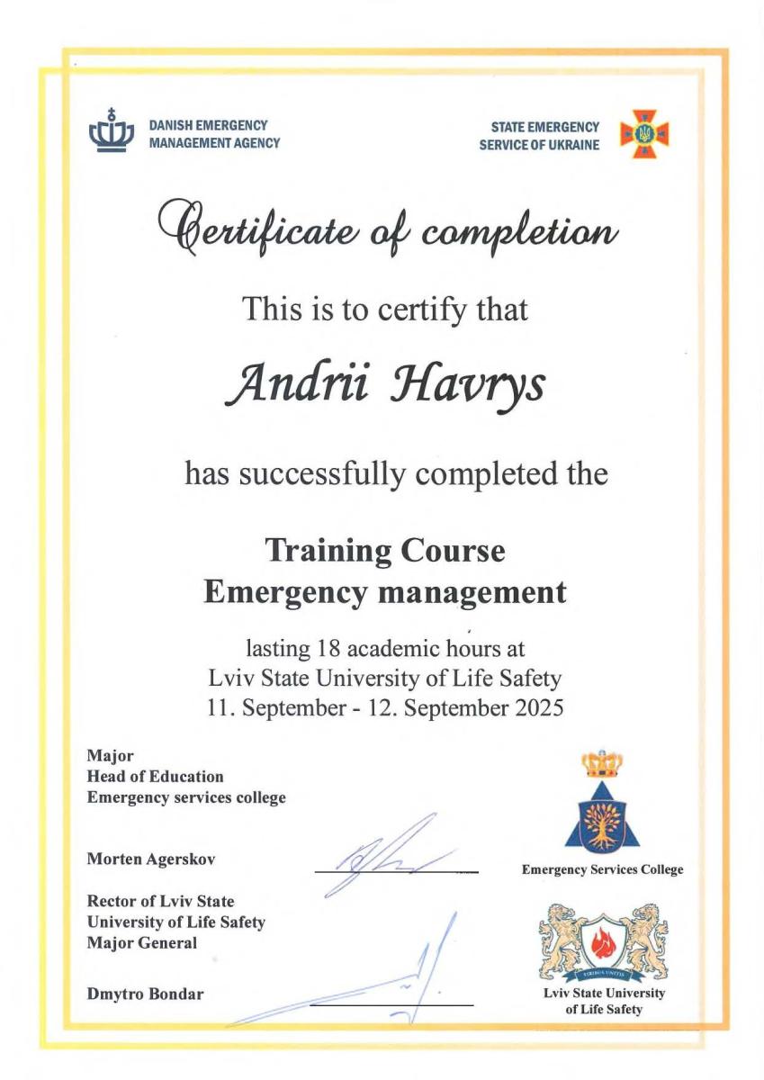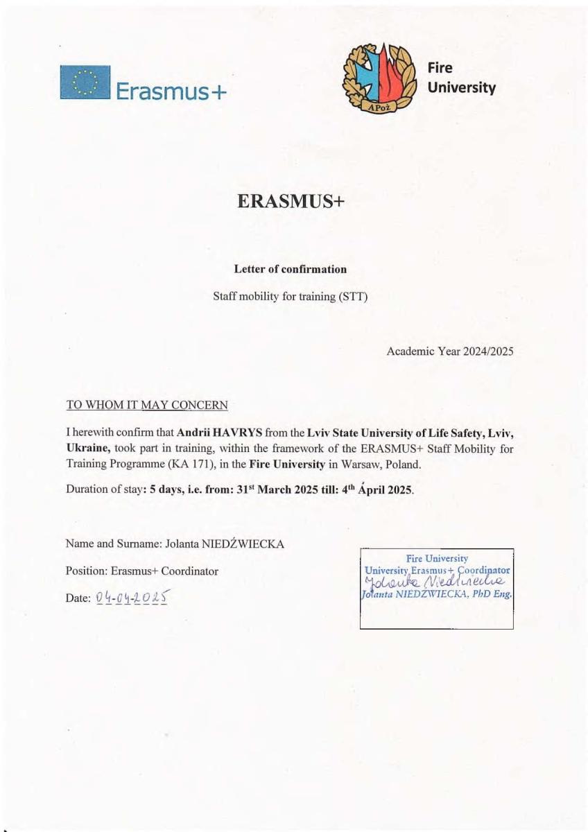 В 2025 р. приймав участь в академічному візиті до Пожежного університету, м. Варшава в рамках проекту ERASMUS+.