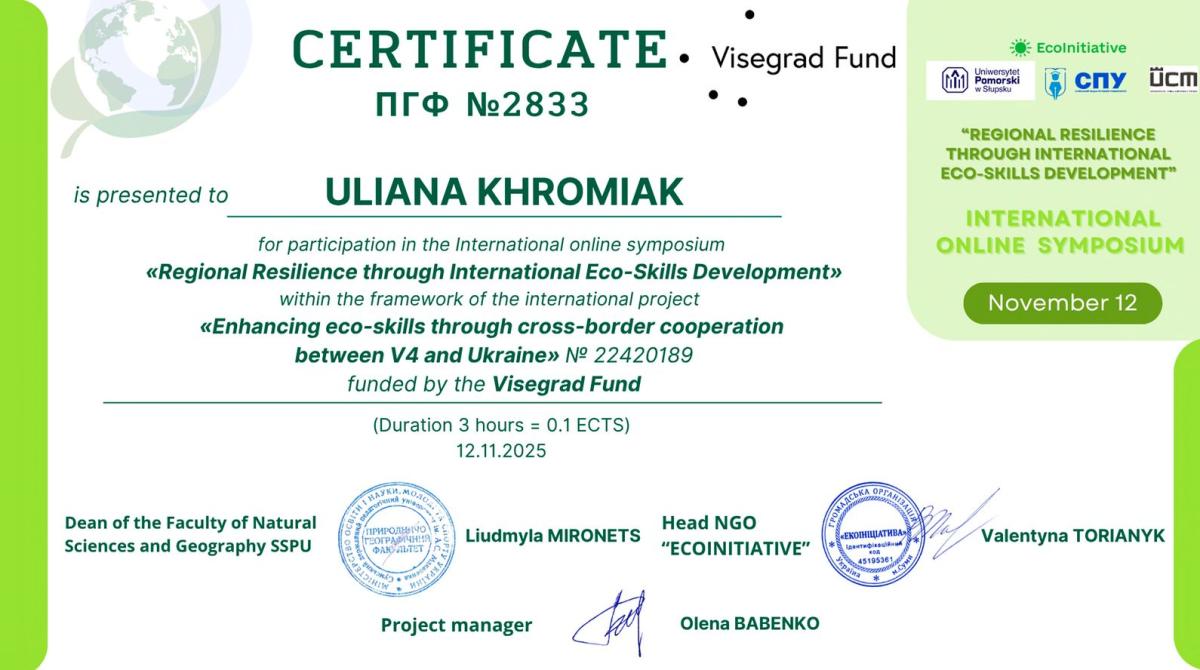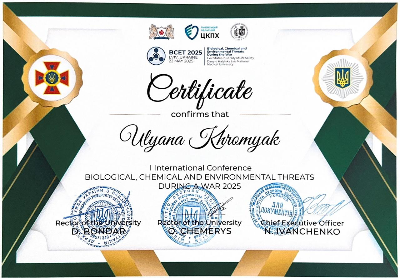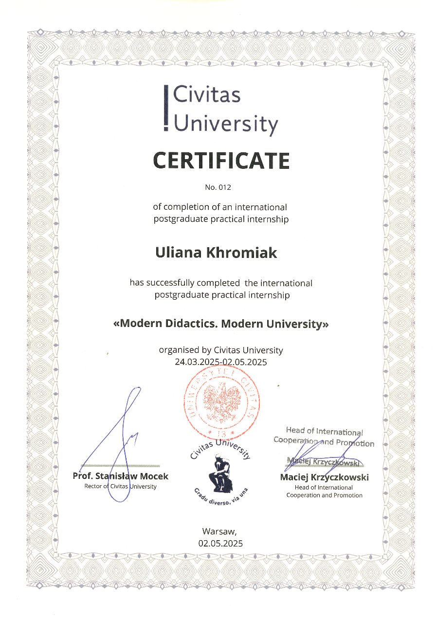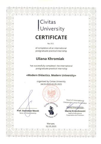 Міжнародне стажування «Modern Didactics. Modern University» у Civitas University (Warsaw, Poland) у період з 24 березня по 2 травня 2025 року. Свідоцтво № 012, від «2» травня 2025 року. (6 кредитів ЕСTS/180 год).