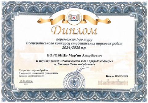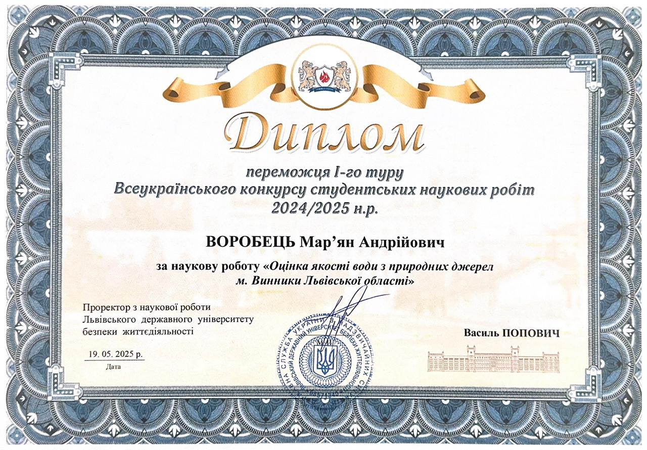 Керівництво здобувачем Воробцем М.А., який став переможцем І туру Всеукраїнського конкурсу студентських наукових робіт 2024/2025 н.р. на тему “Оцінка якості води з природних джерел м. Винники Львівської області”, диплом переможця від 19.05.2025 р.