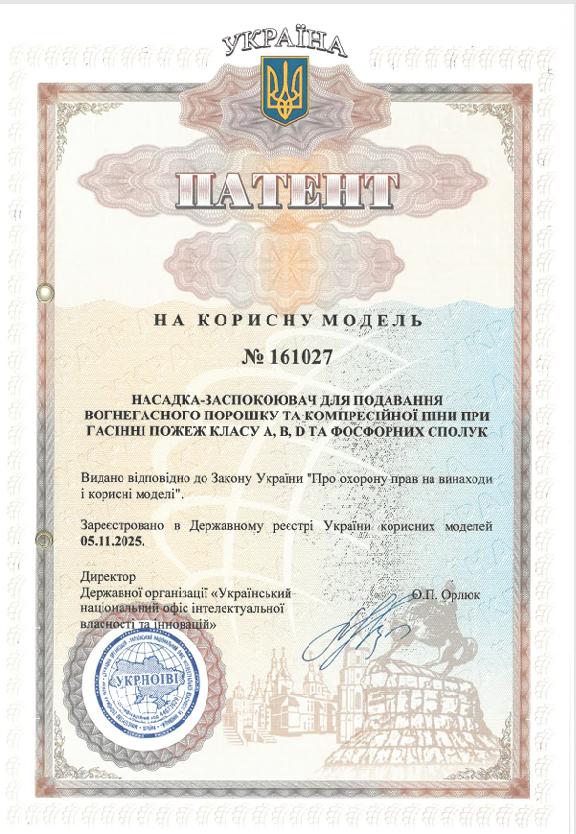 | 1 | Насадка-заспокоювач для подавання вогнегасного порошку та компресійної піни при гасінні пожеж класу А, В, D та фосфорних сполук | Ковалишин Василь Васильович Марич Володимир Михайлович Веселівський Роман Богданович Ковалишин Володимир Васильович |