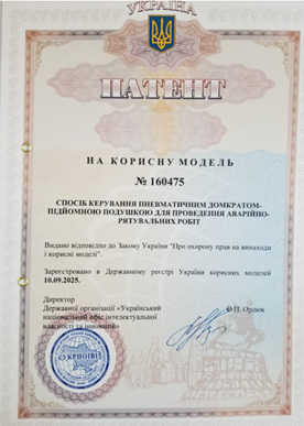 | 2 | Спосіб керування пневматичним домкратом-підйомною подушкою для проведення аварійно-рятувальних робіт | Товарянський Володимир Ігорович Назаровець Олег Богданович Руденко Дмитро Васильович Паснак Іван Васильович Швець Микола Миколайович Нагірняк Юрій Михайлович Лобода Дмитро Іванович Адольф Іван Іванович Бойчук Богдан Ярославович Домінік Андрій Михайлович |