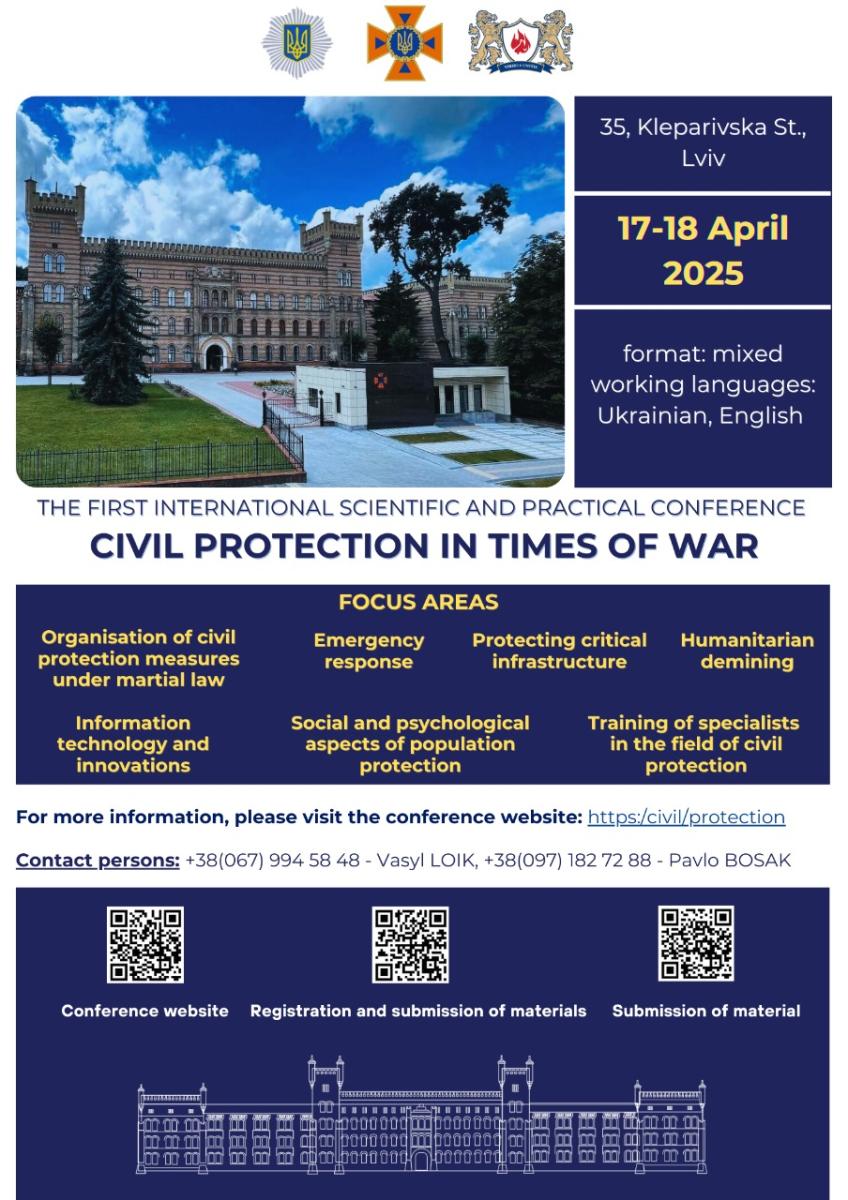 Конференція присвячена актуальним викликам у сфері цивільного захисту, які постають в умовах війни. Основна мета заходу – обговорення сучасних стратегій і методів забезпечення безпеки населення, захисту критичної інфраструктури, реагування на надзвичайні ситуації та впровадження новітніх технологій. Учасники матимуть можливість обмінятися досвідом, представити власні дослідження та знайти шляхи покращення системи цивільного захисту.