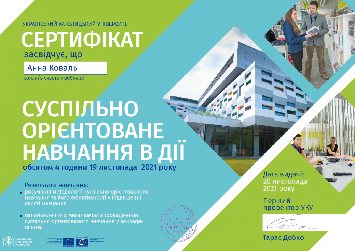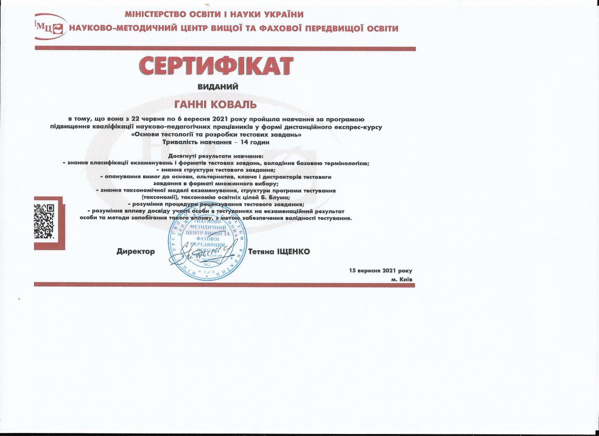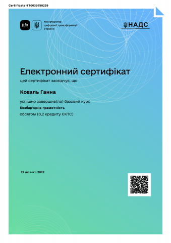 - Національна онлайн-платформа з цифрової грамотності Дія. Цифрова освіта: базовий курс: "Базові цифрові навички", 08 лютого 2022 р. (0,6 кредита).