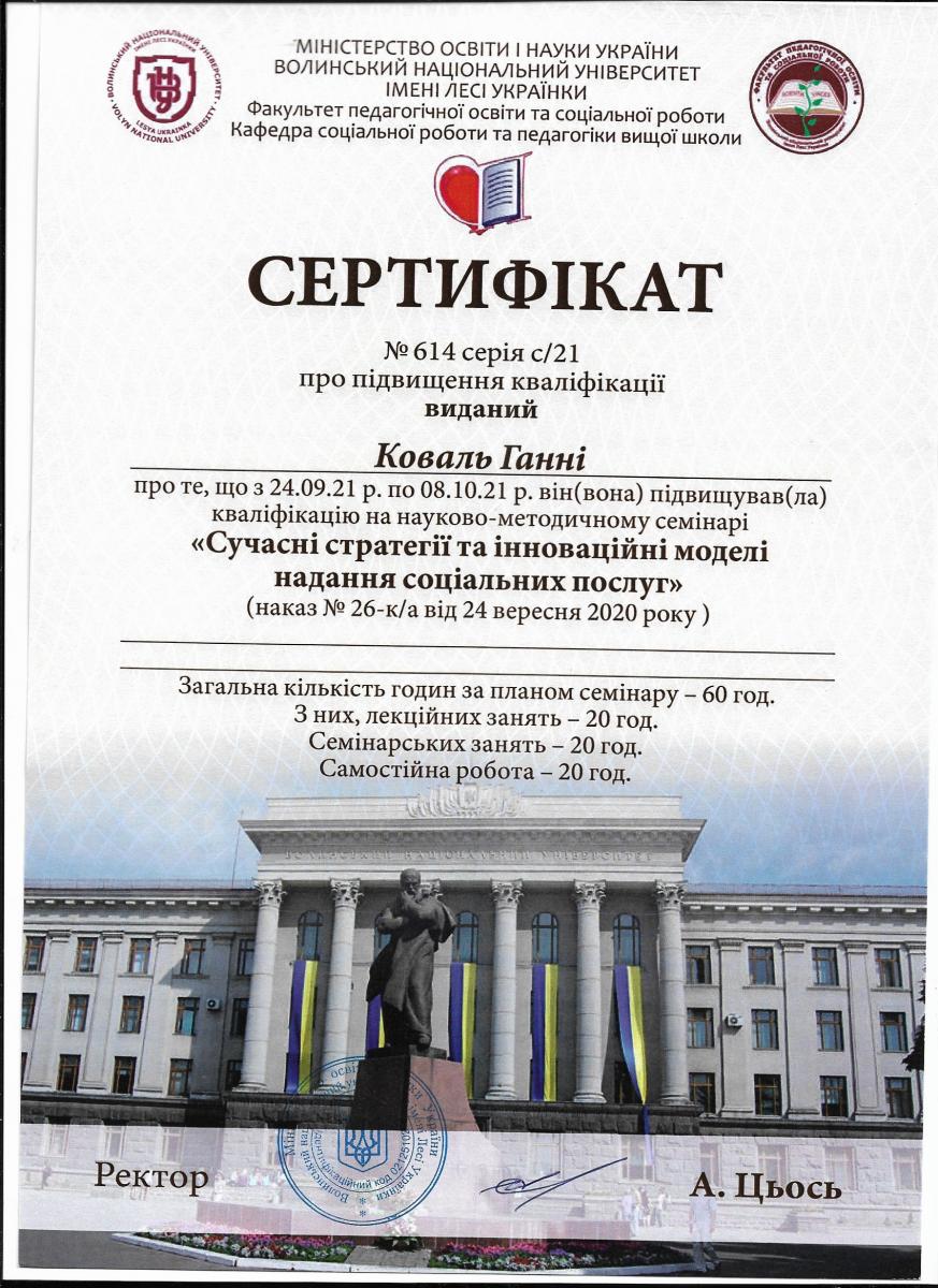 - Науково-методичний семінар «Сучасні стратегії та інноваційні моделі надання соціальних послуг», 24 вересня – 08 жовтня 2021 р. (60 годин).