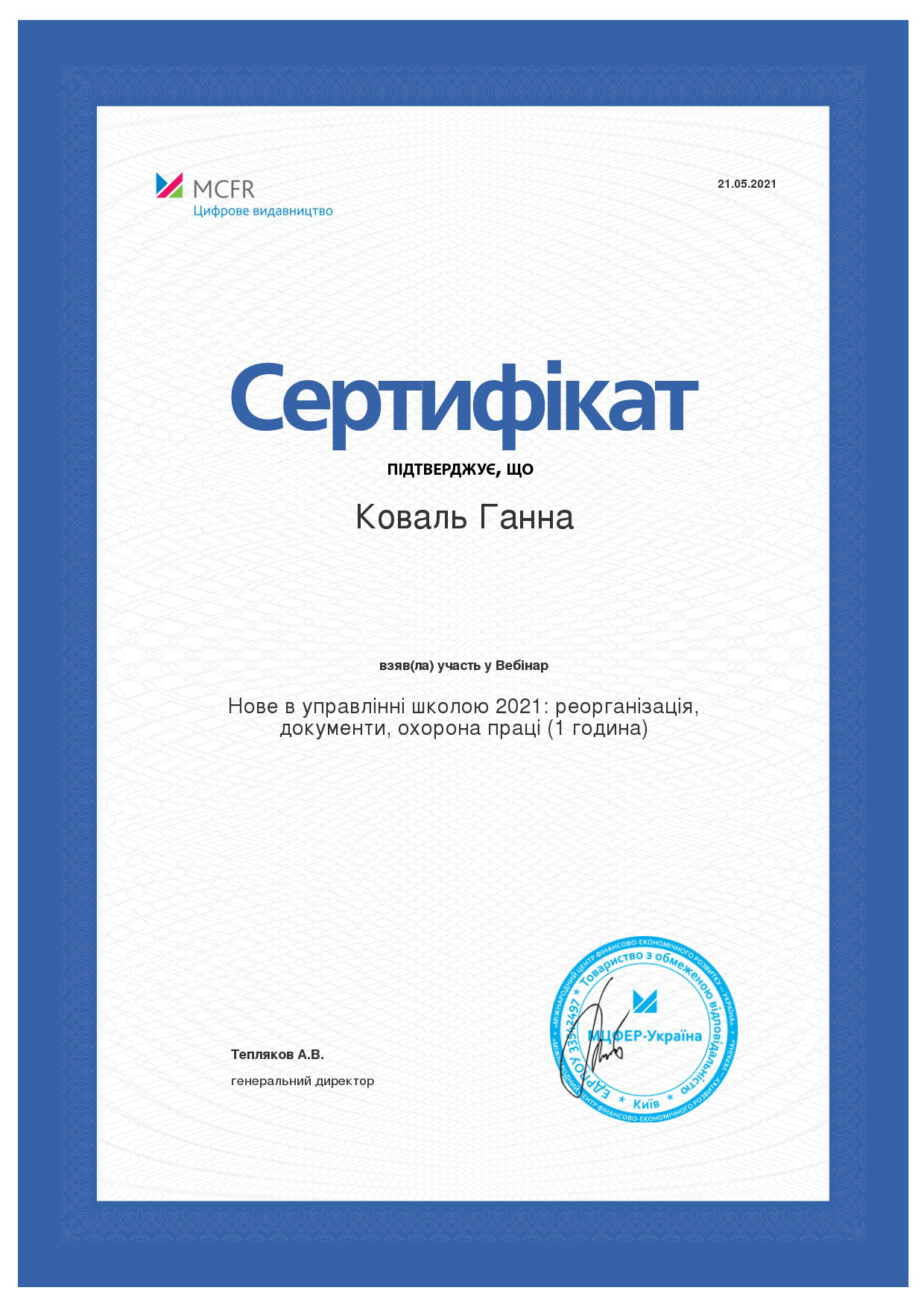 - Нове в управлінні школою 2021 : реорганізація, документи, охорона праці, 21 травня 2021 (0,3 кредити).