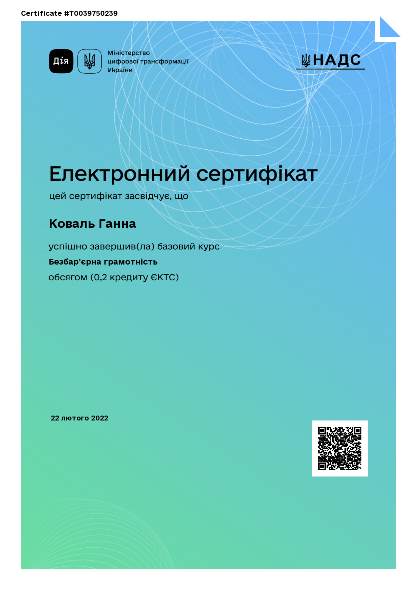 - Національна онлайн-платформа з цифрової грамотності Дія. Цифрова освіта: базовий курс: "Безбар'єрна грамотність", 23 лютого 2022 р. (0,2 кредити).