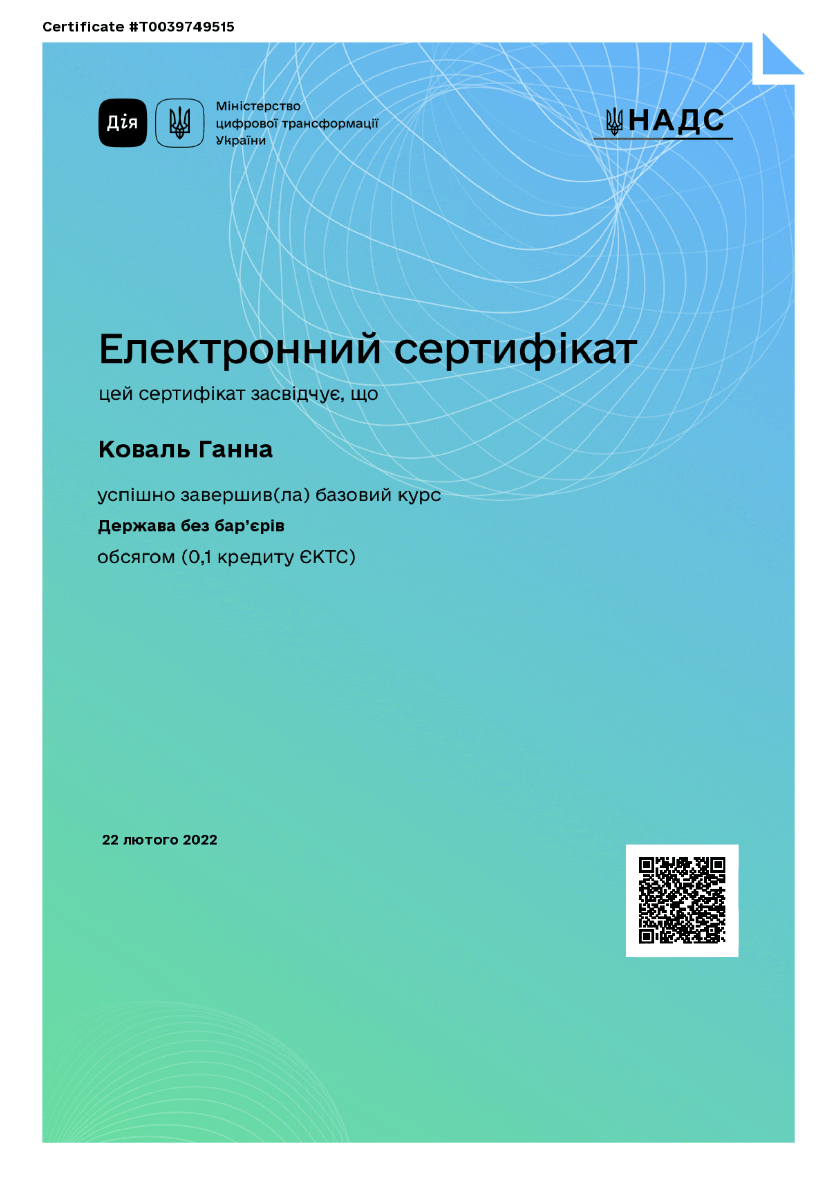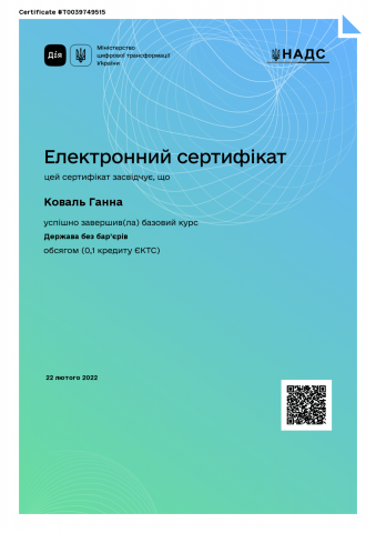 - Національна онлайн-платформа з цифрової грамотності Дія. Цифрова освіта: базовий курс: "Держжава без бар'єрів", 23 лютого 2022 р. (0,1 кредити).