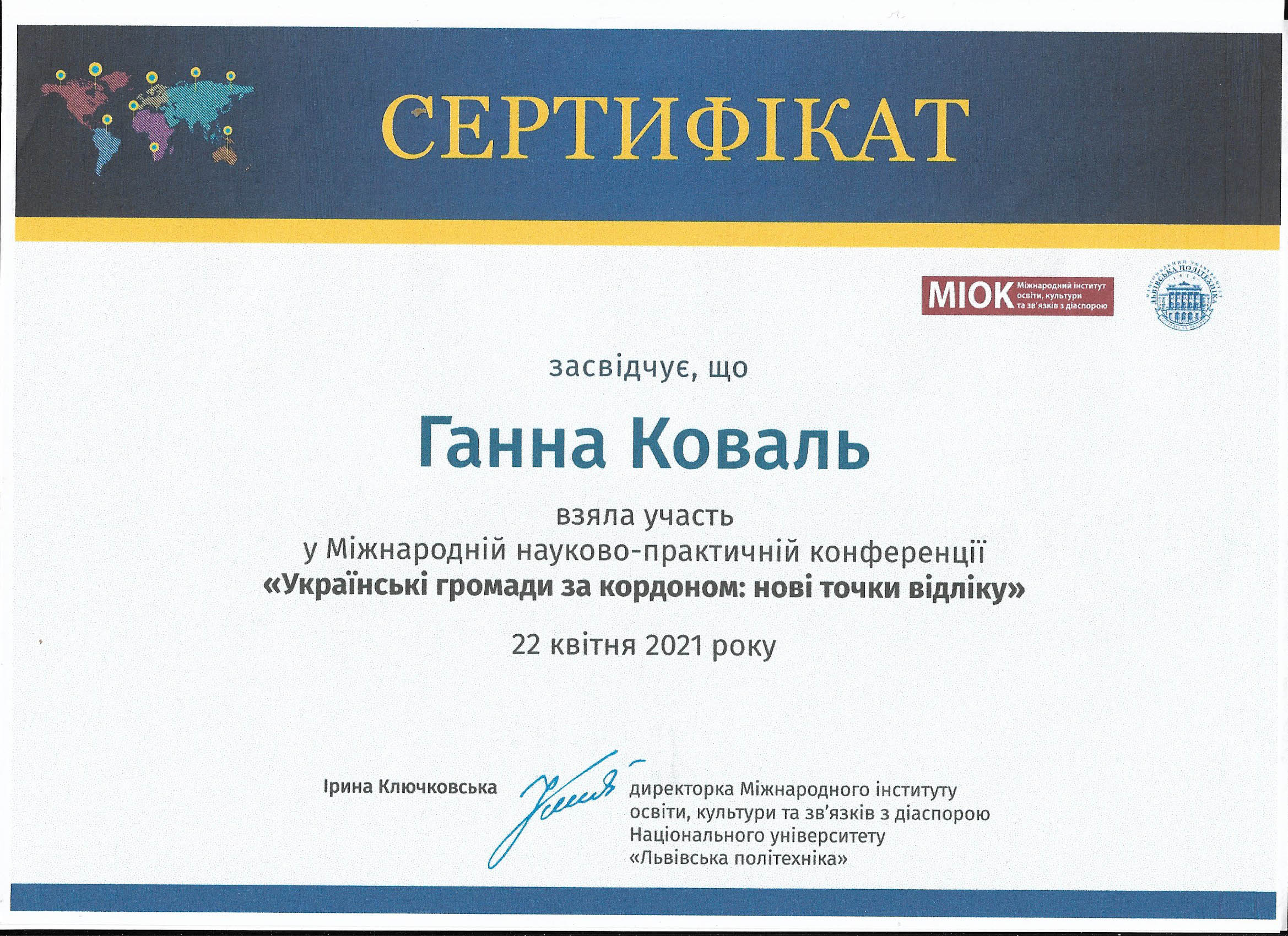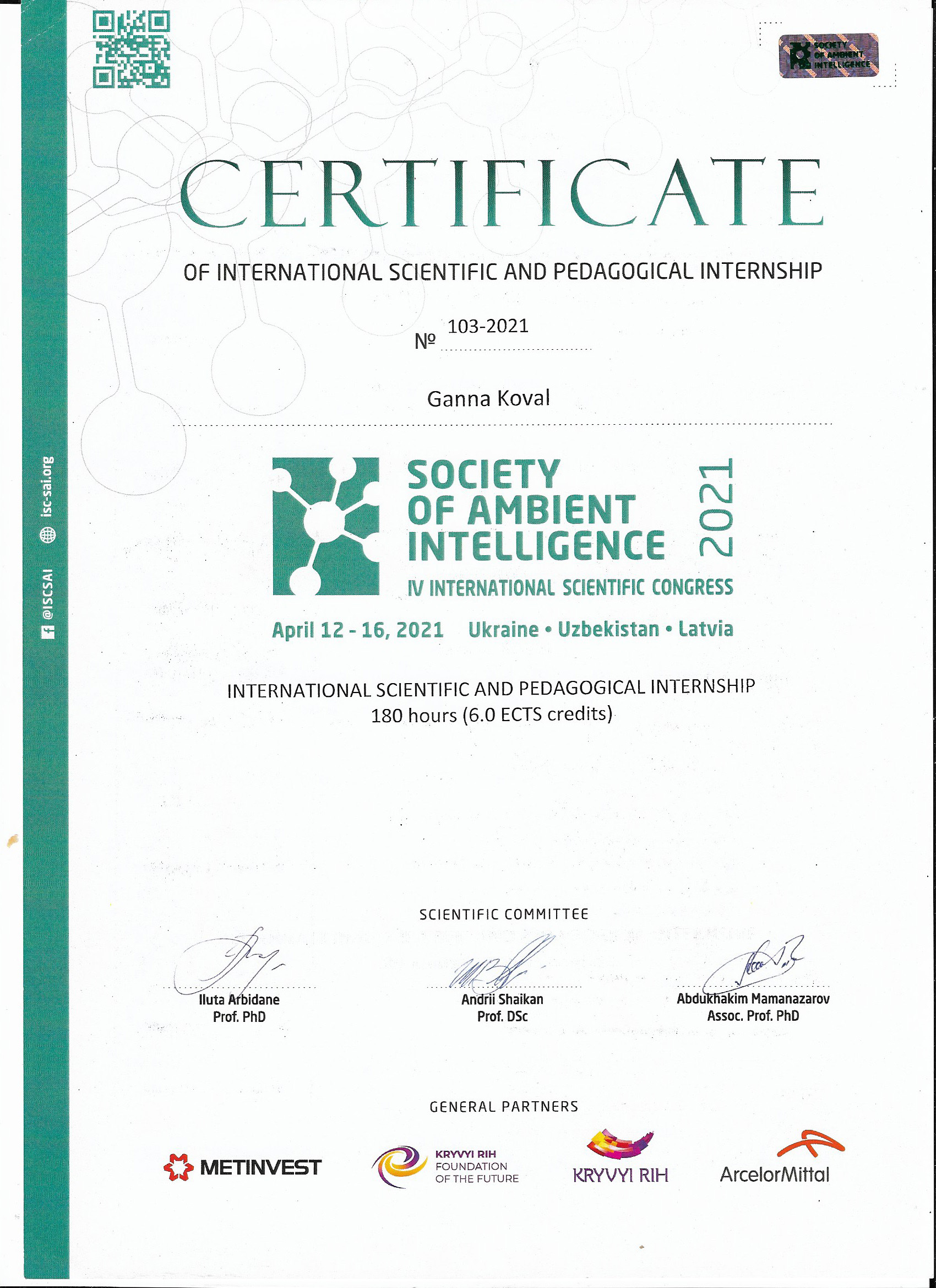 - IV International Scientific Congress SOCIETY OF AMBIENT INTELLIGENCE 2021, April 12-16, 2021 (Ukraine-Uzbekistan-Latvia) International scientific and pedagogical internship (6 кредитів).