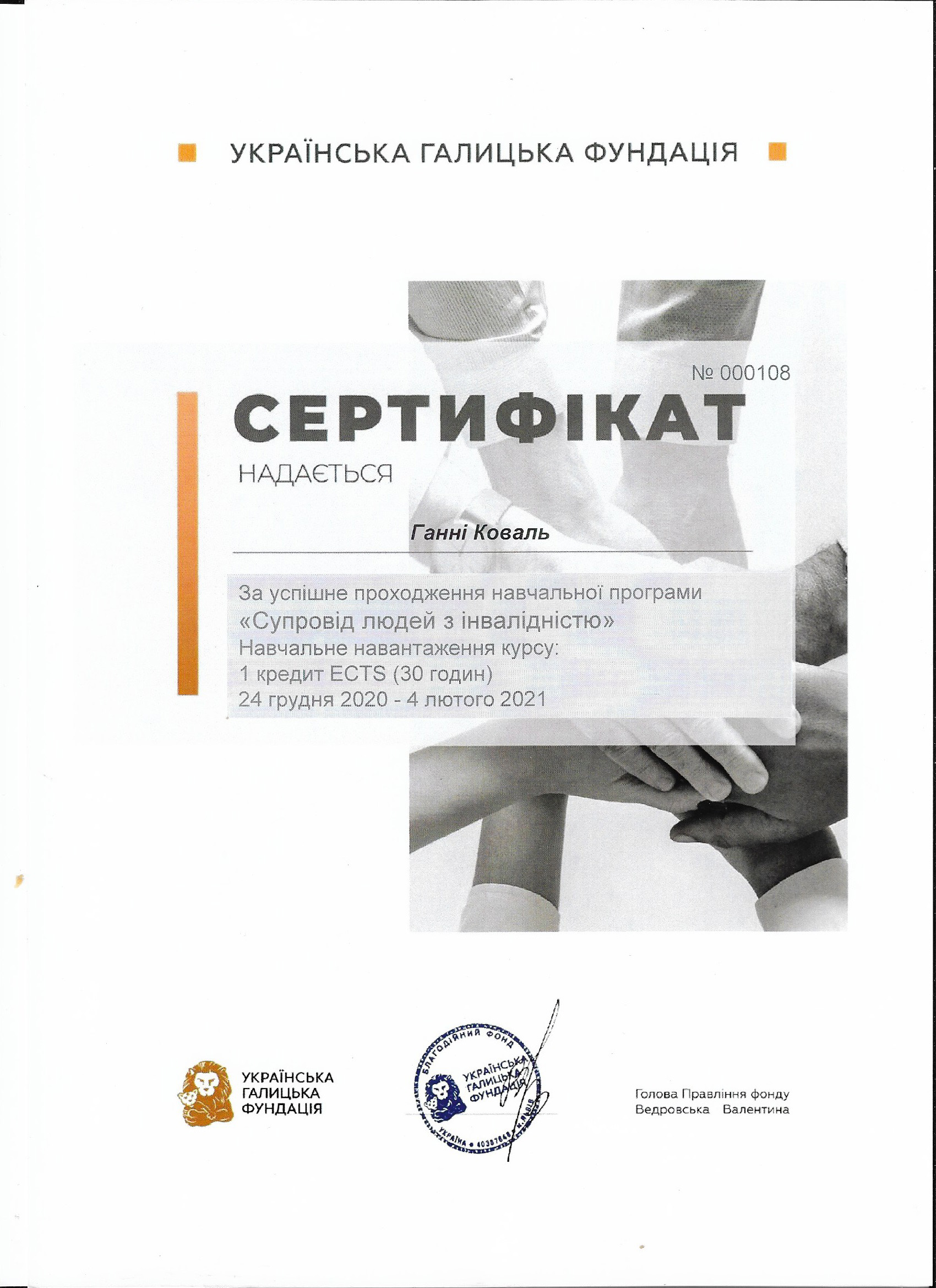 - Навчальна програма «Супровід людей з інвалідністю», 24 грудня-4 лютого 2021 р. (1 кредит).