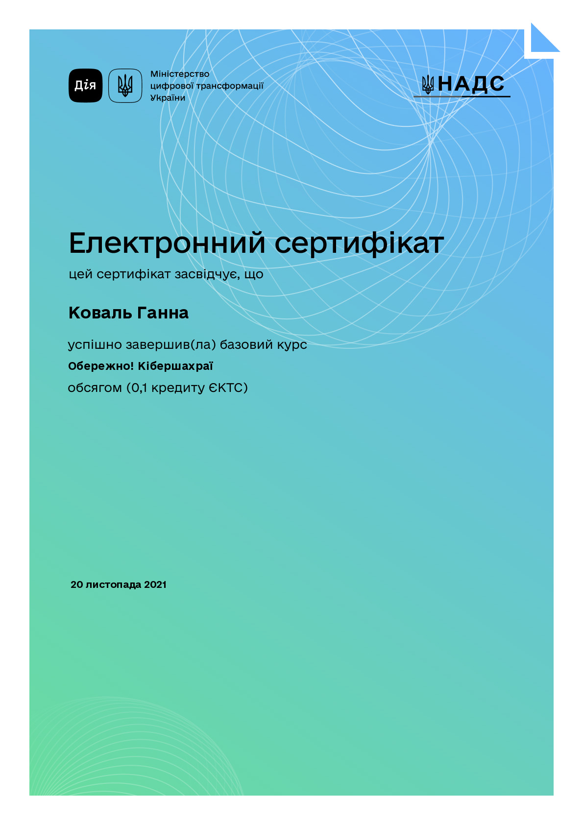 - Національна онлайн-платформа з цифрової грамотності Дія. Цифрова освіта: базовий курс «Обережно! Кібершахраї!», 20 листопада 2021 р. (0,1 кредити).