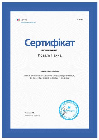 - Національна онлайн-платформа з цифрової грамотності Дія. Цифрова освіта: базовий курс із цифрової грамотності (початковий рівень) для державних службовців «Цифрова грамотність державних службовців 1.0. на базі інструментів Google», 13 травня 2021 р. (0,1 кредити).