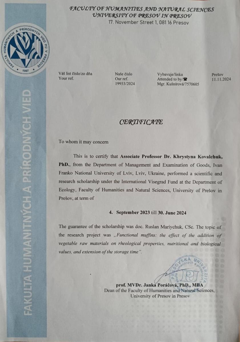 1.Kovalchuk К. Studying consumer properties of the developed cupcakes using non-traditional raw materials / К. Kovalchuk, H. Ozimok, R. Mariychuk, O. Gyrka, M. Bodak, N. Palko, O. Davydovych, A. Tkachenko, L. Huba // Eastern-European Journal of Enterprise Technologies. № 4/11 (100). 2019. Р. 38-45. – ISSN 1729-3774. (включено до міжнародної наукометричної бази Scopus).
