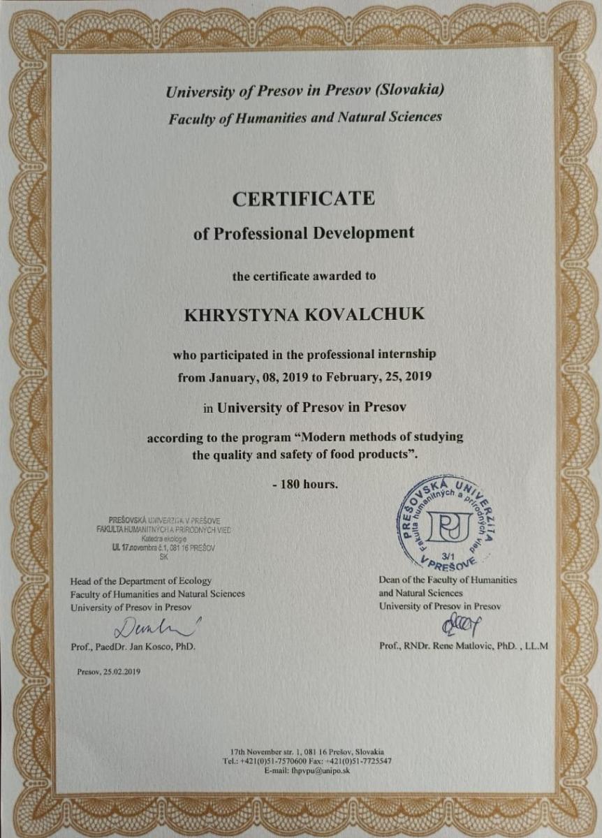 2.Kovalchuk К. Determination of safety indicators in the developed muffins with non-traditional raw materials / К. Kovalchuk, H. Ozimok, R. Mariychuk, O. Gyrka, M. Bodak, N. Palko, O. Davydovych, A. Tkachenko, L. Huba // “EUREKA: Life Sciences”. 2019. Number 4. Р. 28-36. (Стаття у виданні України, яке включено до міжнародних наукометричних баз ResearchBib, Googl Scholar, Index Copernicus, Eurasian Scientific Journal Index, IndianScience.in, WorldCat).