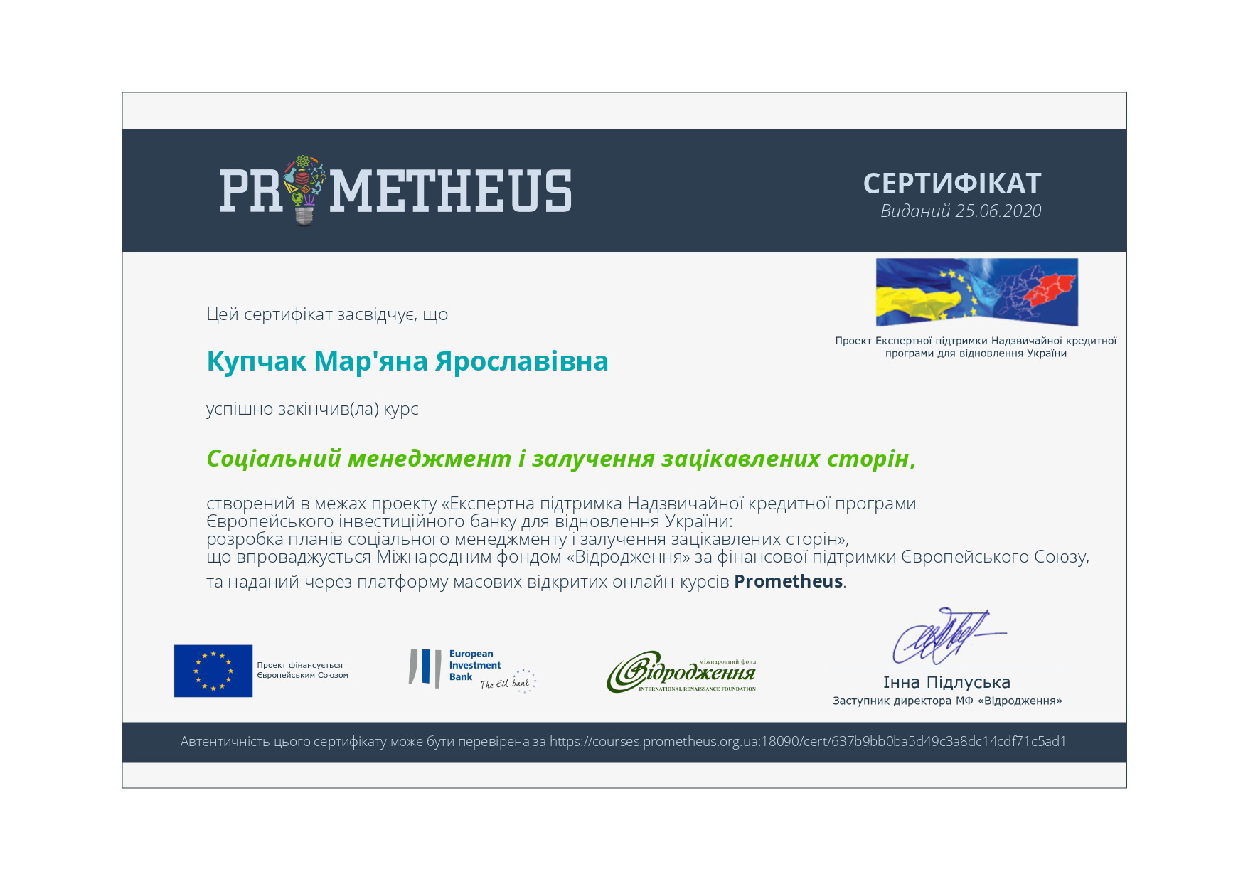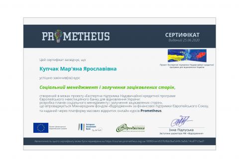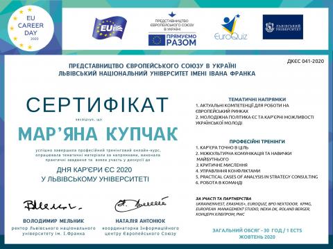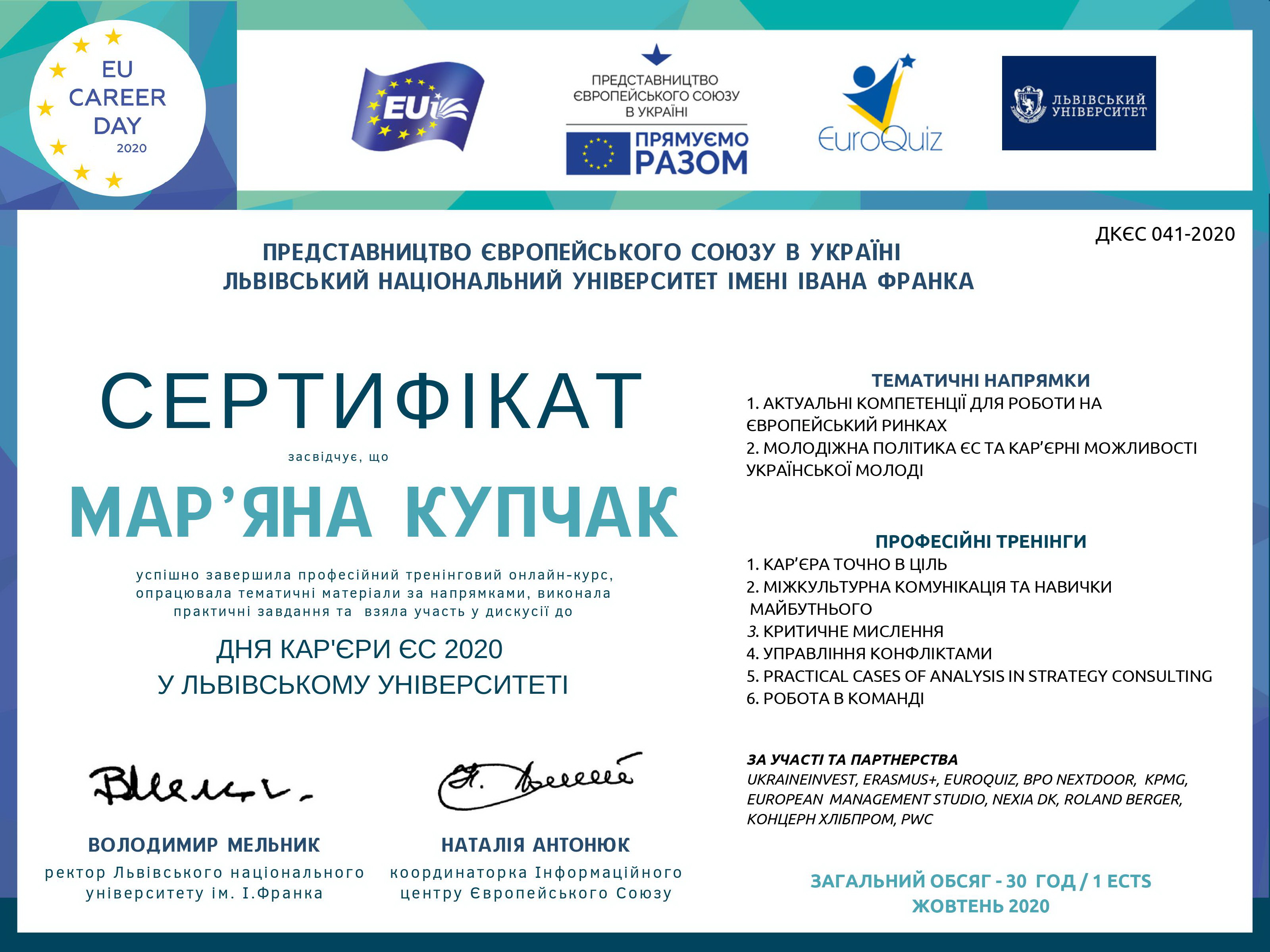 - Львівський національний університет імені Івана Франка професійний тренінговий онлайн-курс EU Career DAY | День кар'єри ЄС 2020 online. (жовтень 2020). Сертифікат ДКЄС 041-2020. Загальний обсяг - 30 год / 1 ECTS;