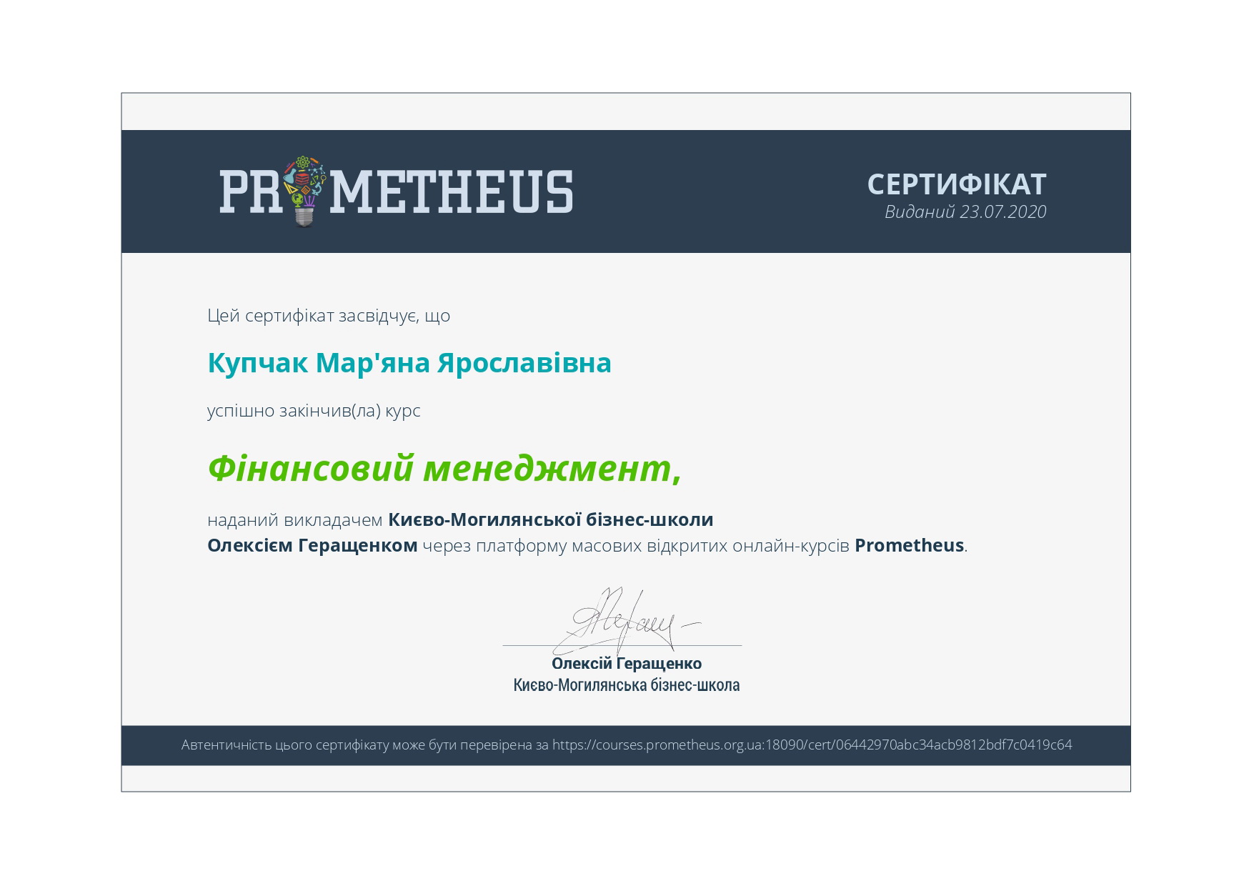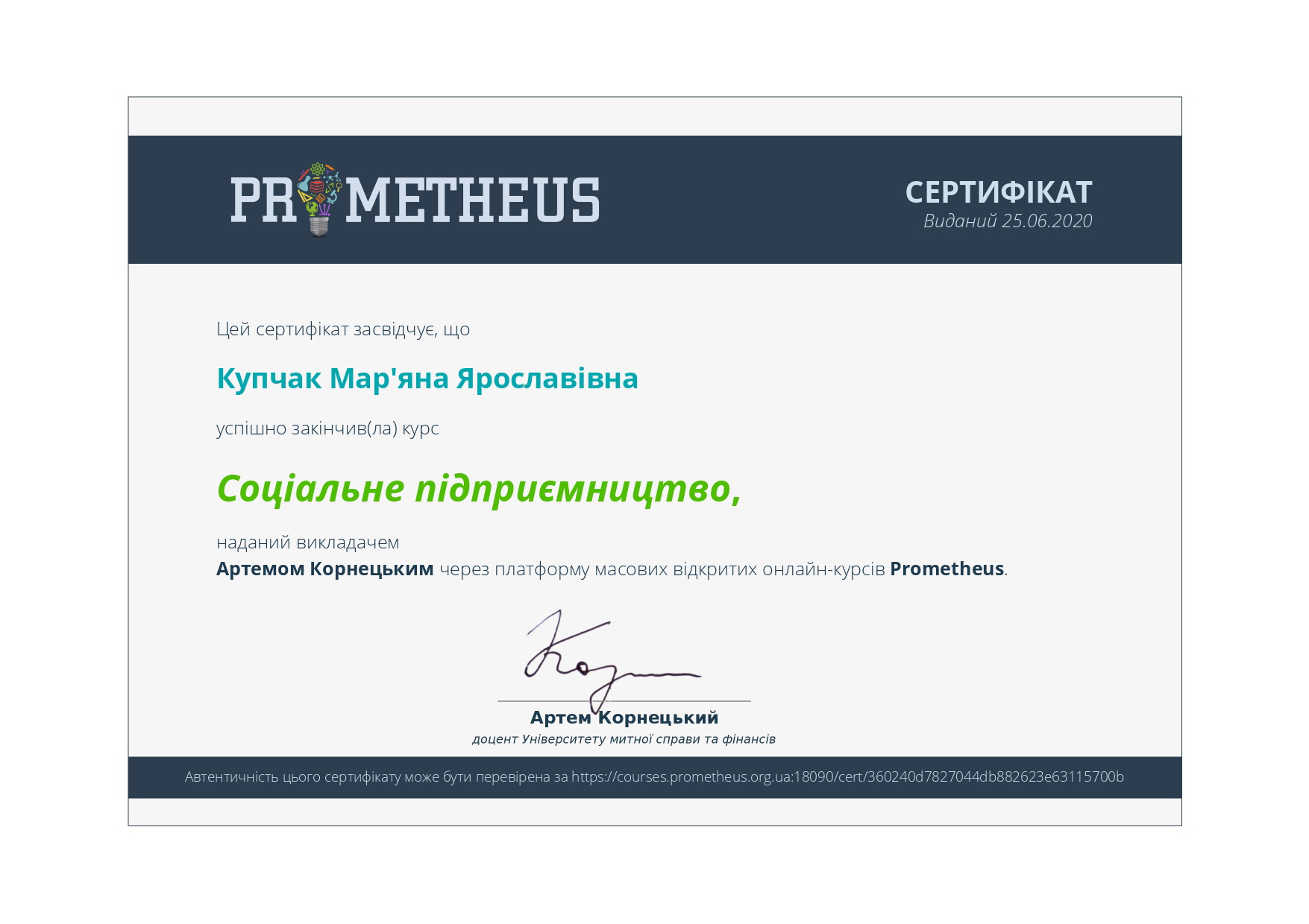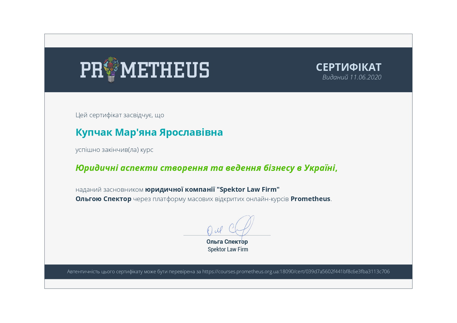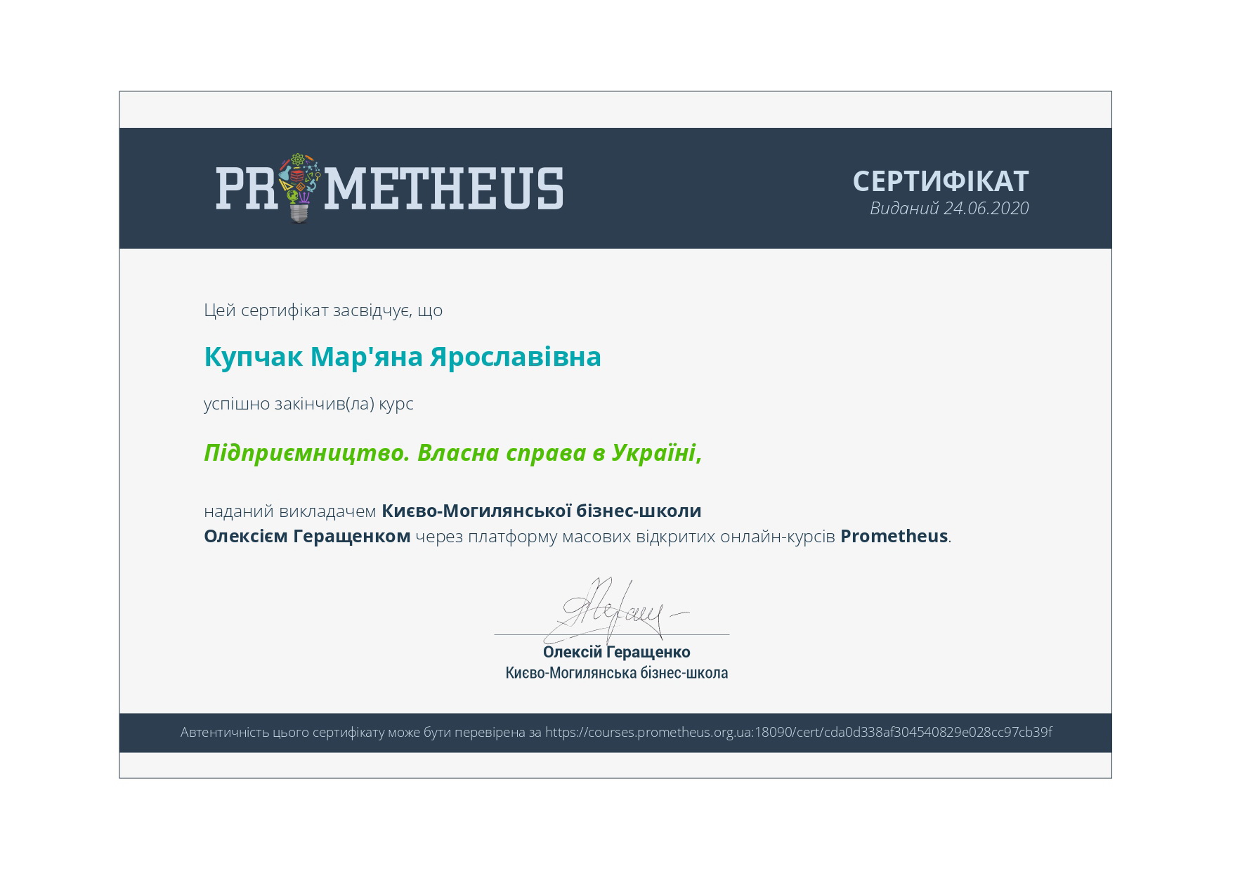 - Онлайн-курси Prometheus: «Юридичні аспекти створення та ведення бізнесу в Україні»; «Фінансовий менеджмент»; «Соціальний менеджмент і залучення зацікавлених сторін»; «Підприємництво. Власна справа в Україні»; «Соціальне підприємництво».