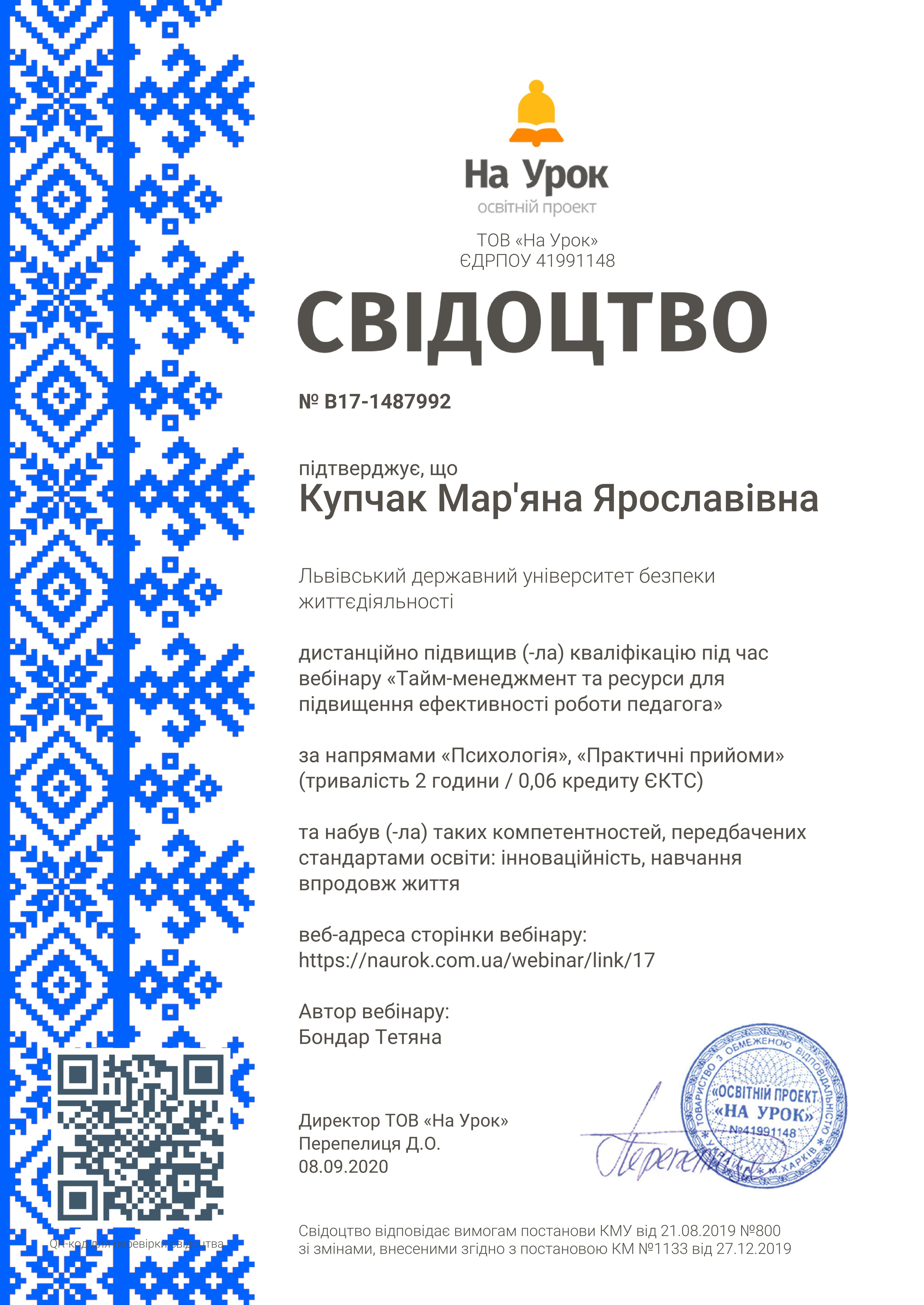 - Освітній проект “На Урок” вебінар «Тайм-менеджмент та ресурси для підвищення ефективності роботи педагога» за напрямами «Психологія», «Практичні прийоми» (тривалість 2 години / 0,06 кредиту ЄКТС). веб-адреса сторінки вебінару: https://naurok.com.ua/webinar/link/17. Свідоцтво № В17-1487992;