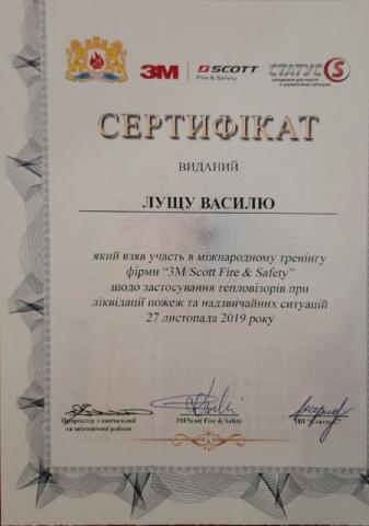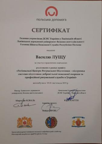 3. Головна Школа Державної Пожежної Служби Республіки Польша, сертифікат, тема "Підтримка системи навчання добровільної пожежної охорони,а також підвищення кваліфікації державних рятувальних служб України", 11 жовтня 2018р.