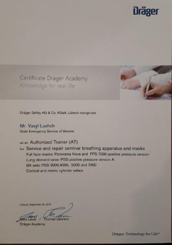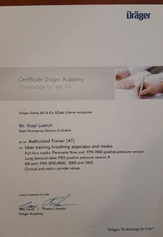 1. Certificate Drager Academy, - Service and repair seminar breathing apparatus and masks; - User training breathing apparatus and masks, Lubeck, September 22, 2016.