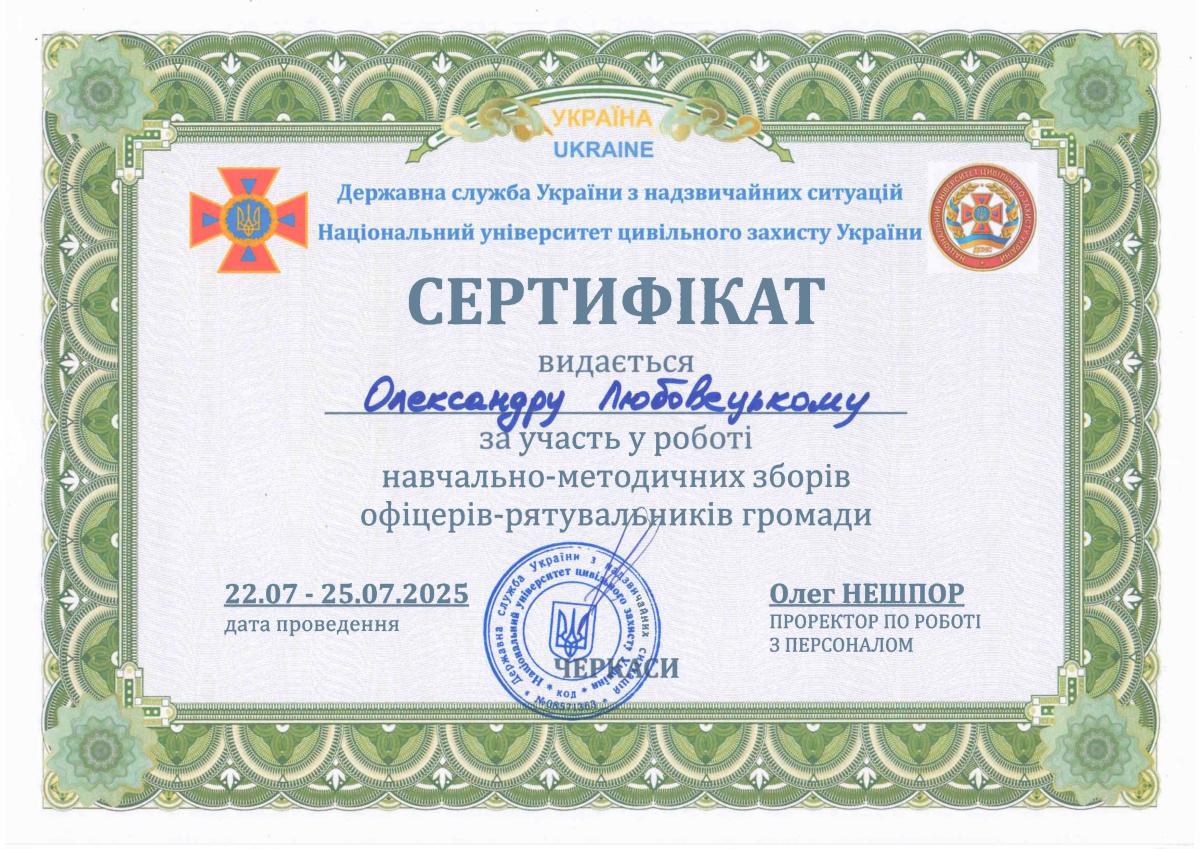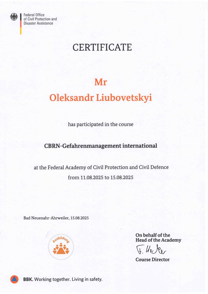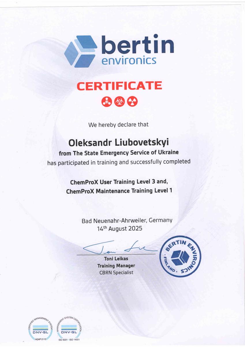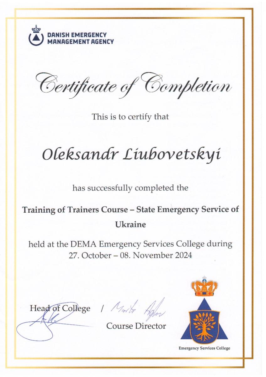 У 2024 році - Пройшов курс підготовки інструкторів Державної служби України з надзвичайних ситуацій щодо реагування на надзвичайні ситуації (події) різного характеру. Королівство Данія (DEMA).