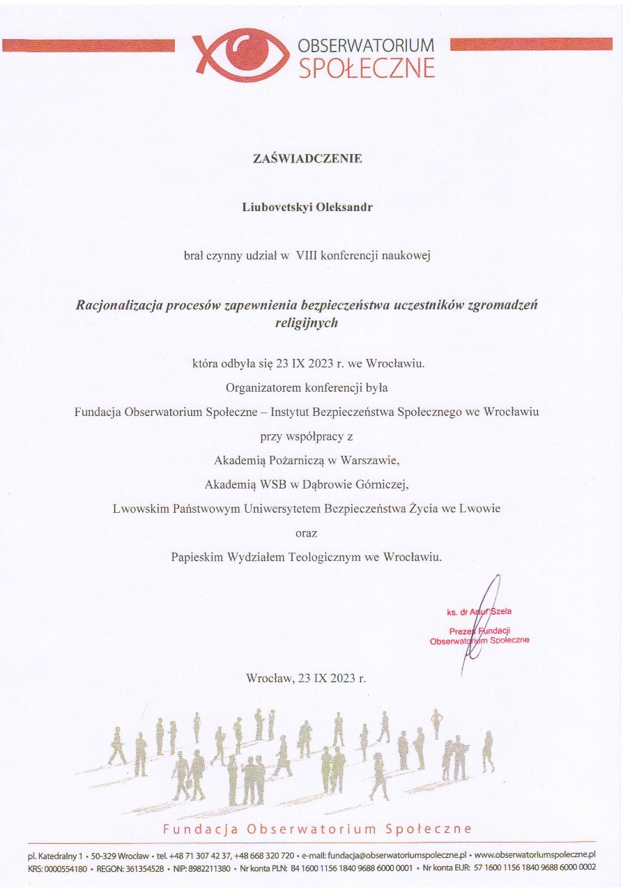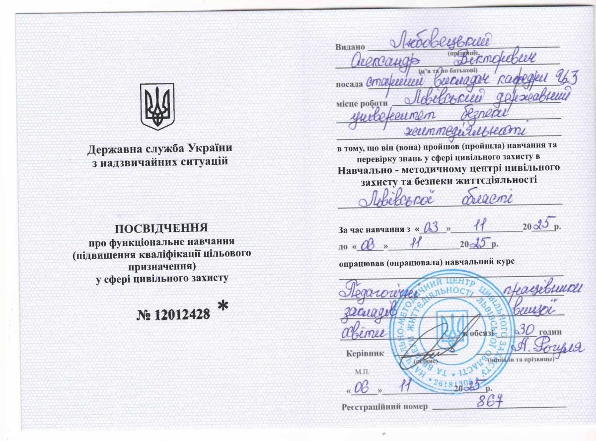 | Alma mater: | Львівський державний університет безпеки життєдіяльності (2017-2021, 2021-2023 рр.) |