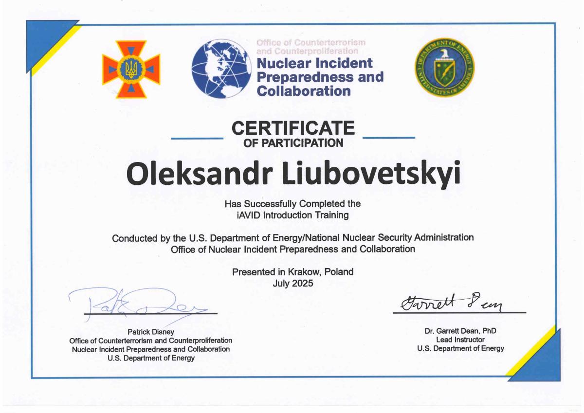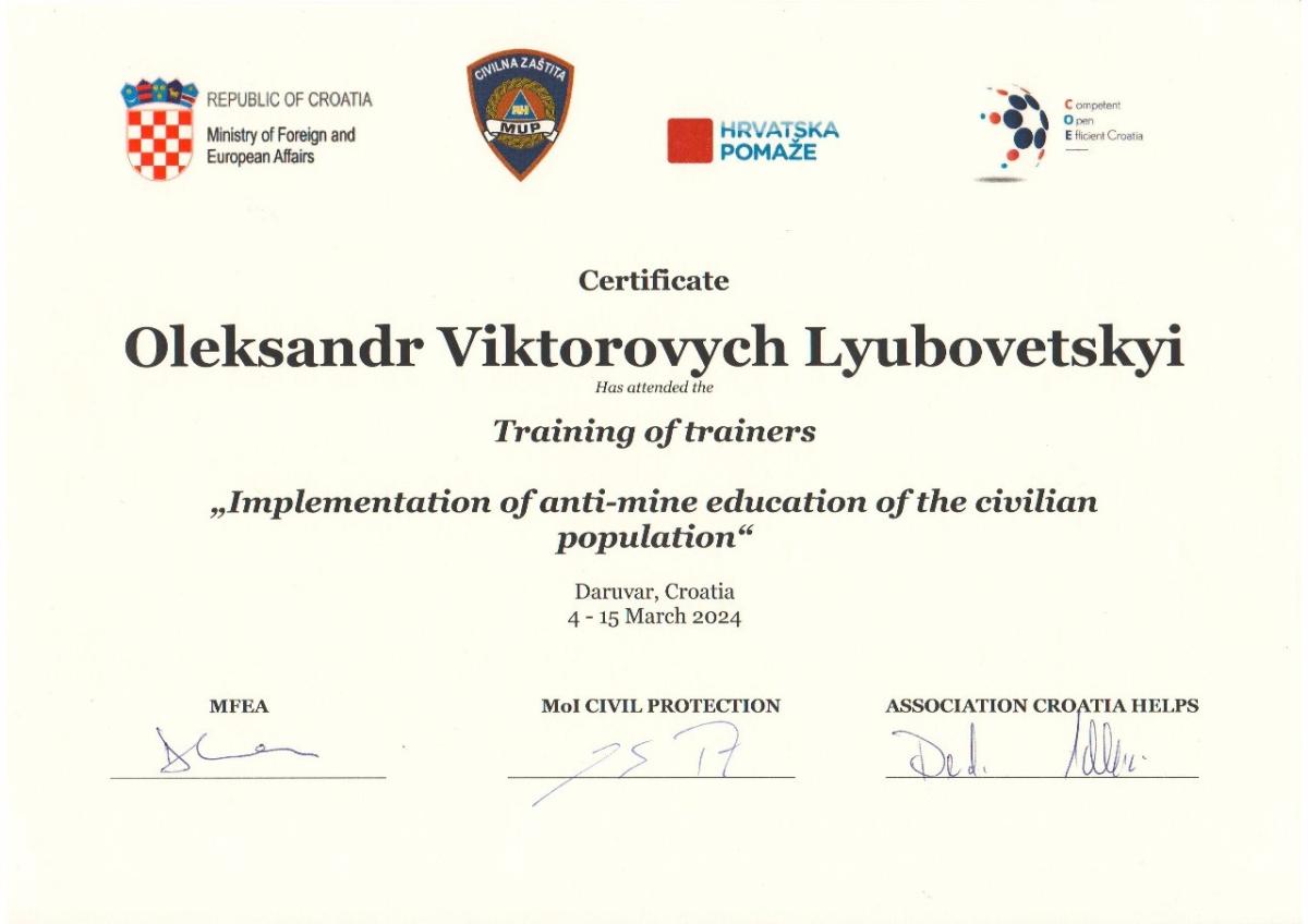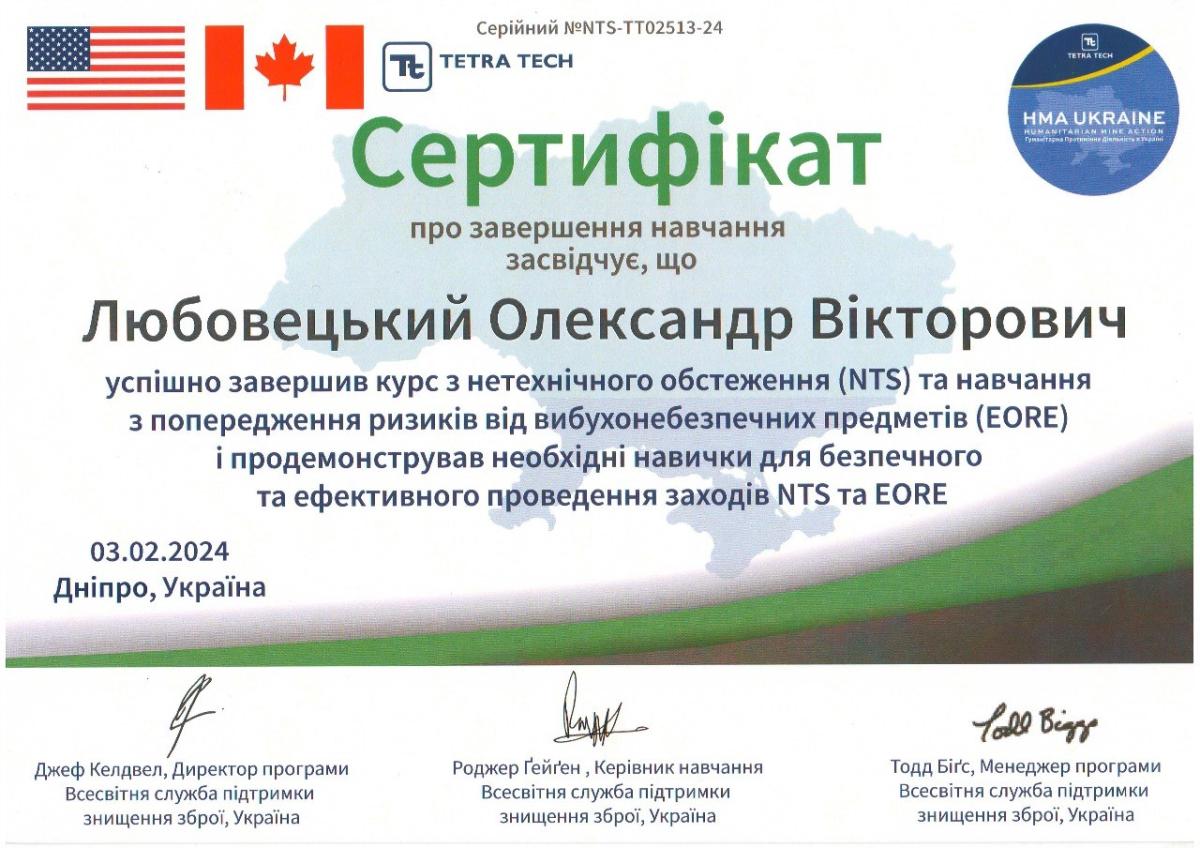 У 2024 році - Пройшов курс з нетехнічного обстеження (NTS) та навчання з попередження ризиків від вибухонебезпечних предметів (EORE) TETRA TECH.