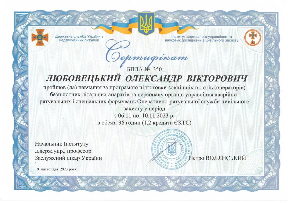 У 2023 році - Пройшов навчання за програмою підготовки зовнішніх пілотів (операторів) безпілотних літальних апаратів та персоналу органів управління аварійно-рятувальних і спеціальних формувань Оперативно-рятувальної служби цивільного захисту