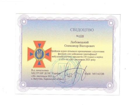 У 2021 році – Пройшов курси цільового призначення з підготовки фахівців для здійснення ідентифікації вибухонебезпечних предметів в МЦ ГР ШР ДСНС України, с. Ватутіне, Харківської області