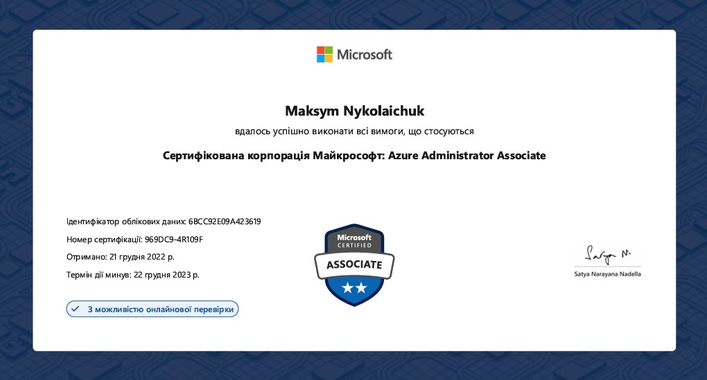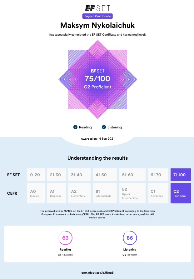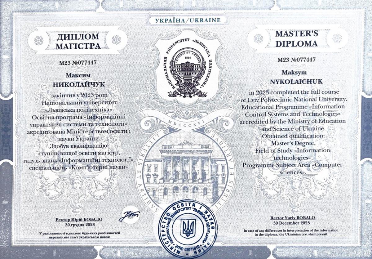 У 2022 році вступив на курс магістратури від Національного Університету “Львівська Політехніка” на кафедру автоматичних систем управління, інституту «Ком’ютерних наук та інформаційних технологій» на спеціальність 122 “Компʼютерні науки”.