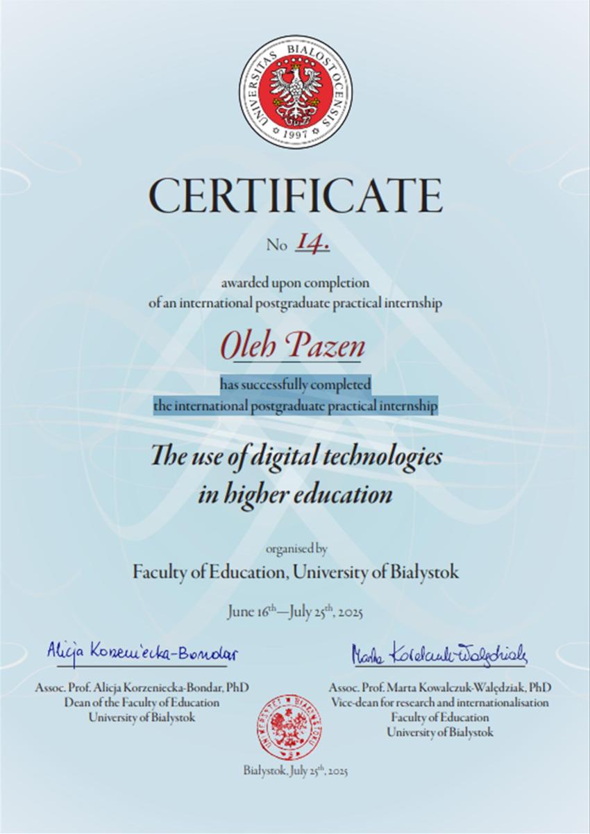 2025р – завершив навчання на факультеті освіти, Університету у Білостоці