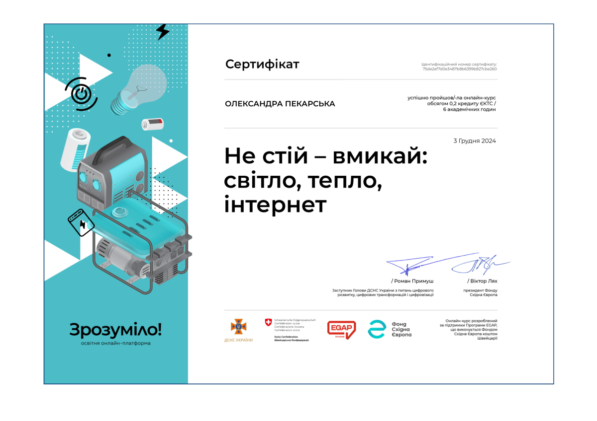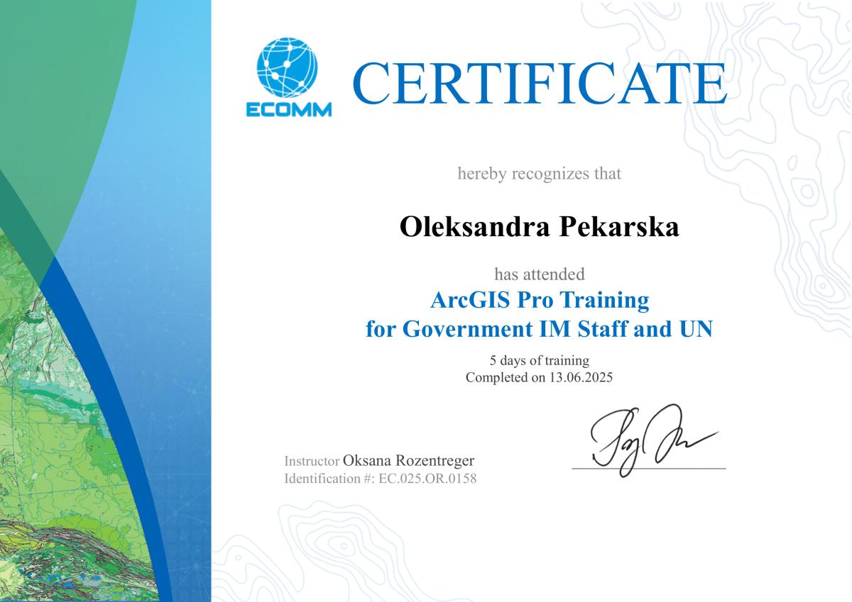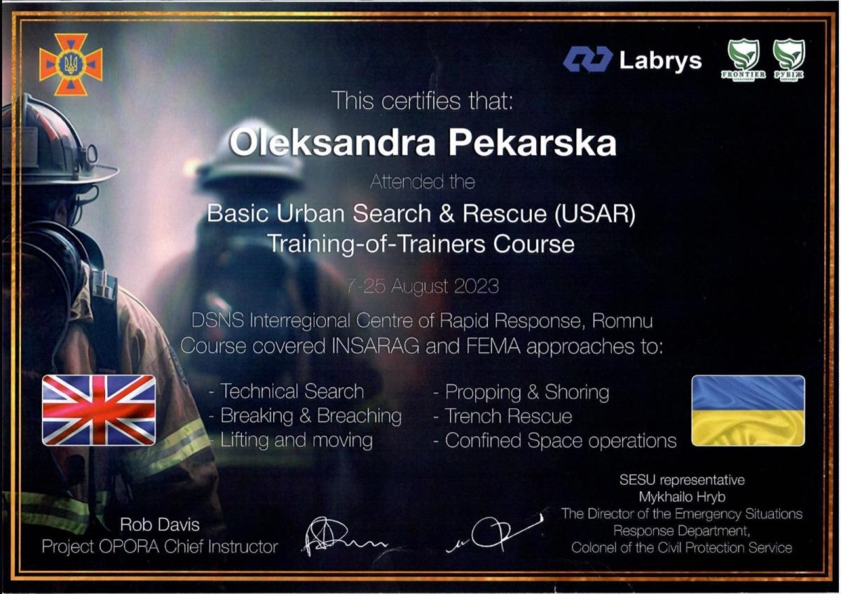 2023 р. – пройшла курс підготовки тренерів «Пошуково-рятувальні роботи в умовах міста» (USAR);