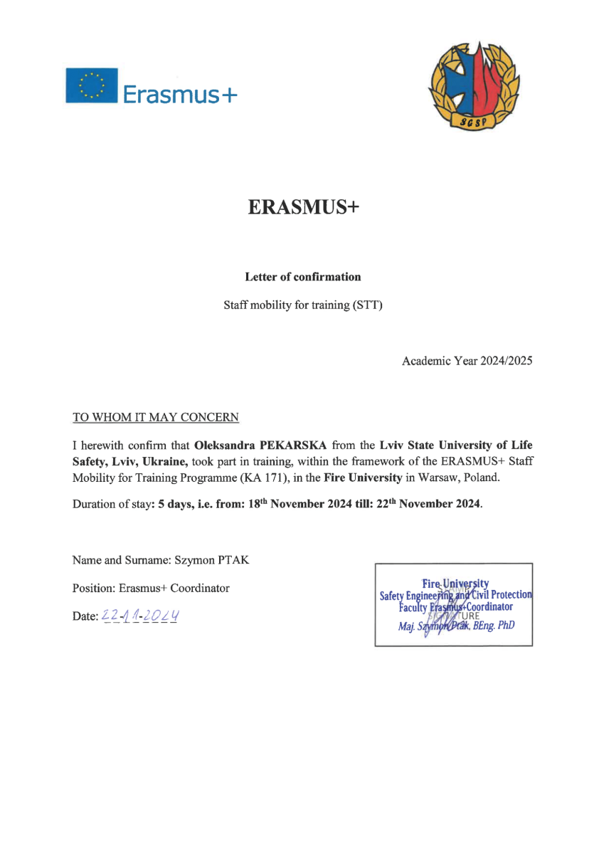 В 2024 р. – прийняла участь в академічному візиті до Пожежного університету, м. Варшава в рамках проекту ERASMUS+.