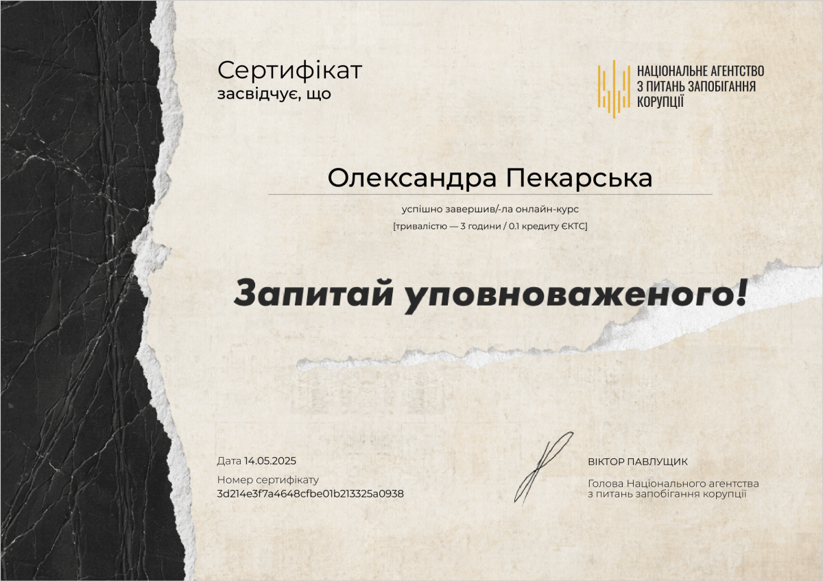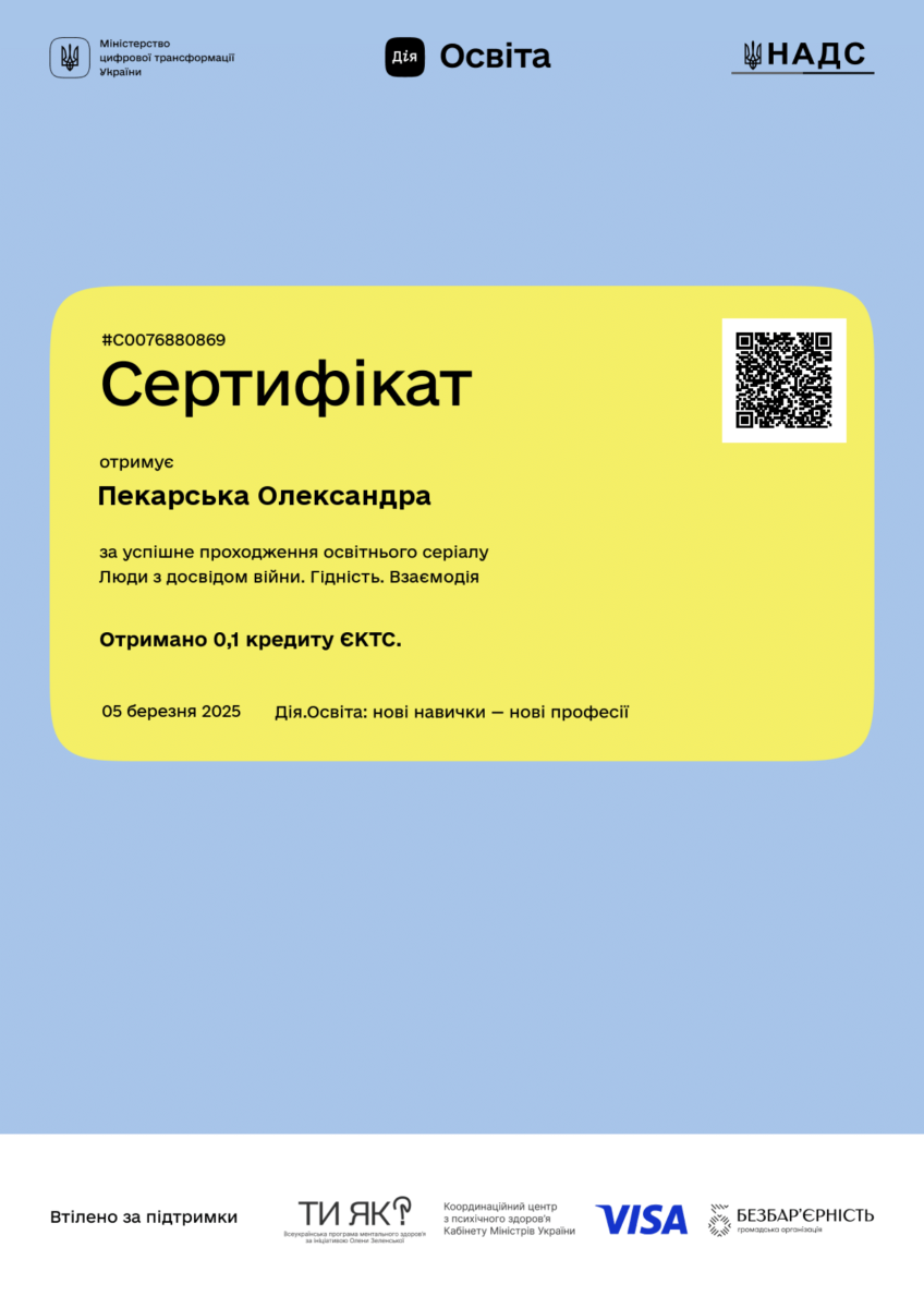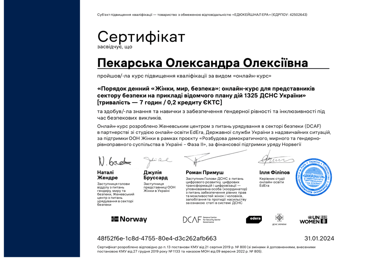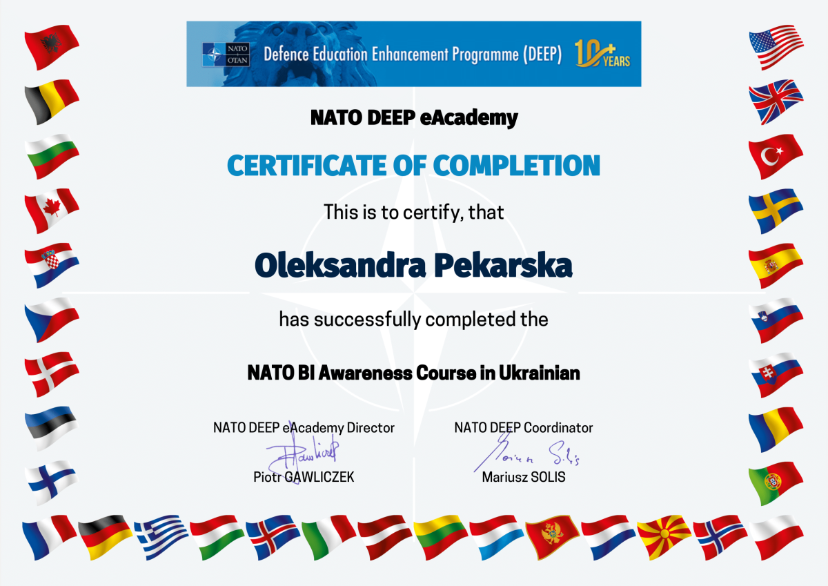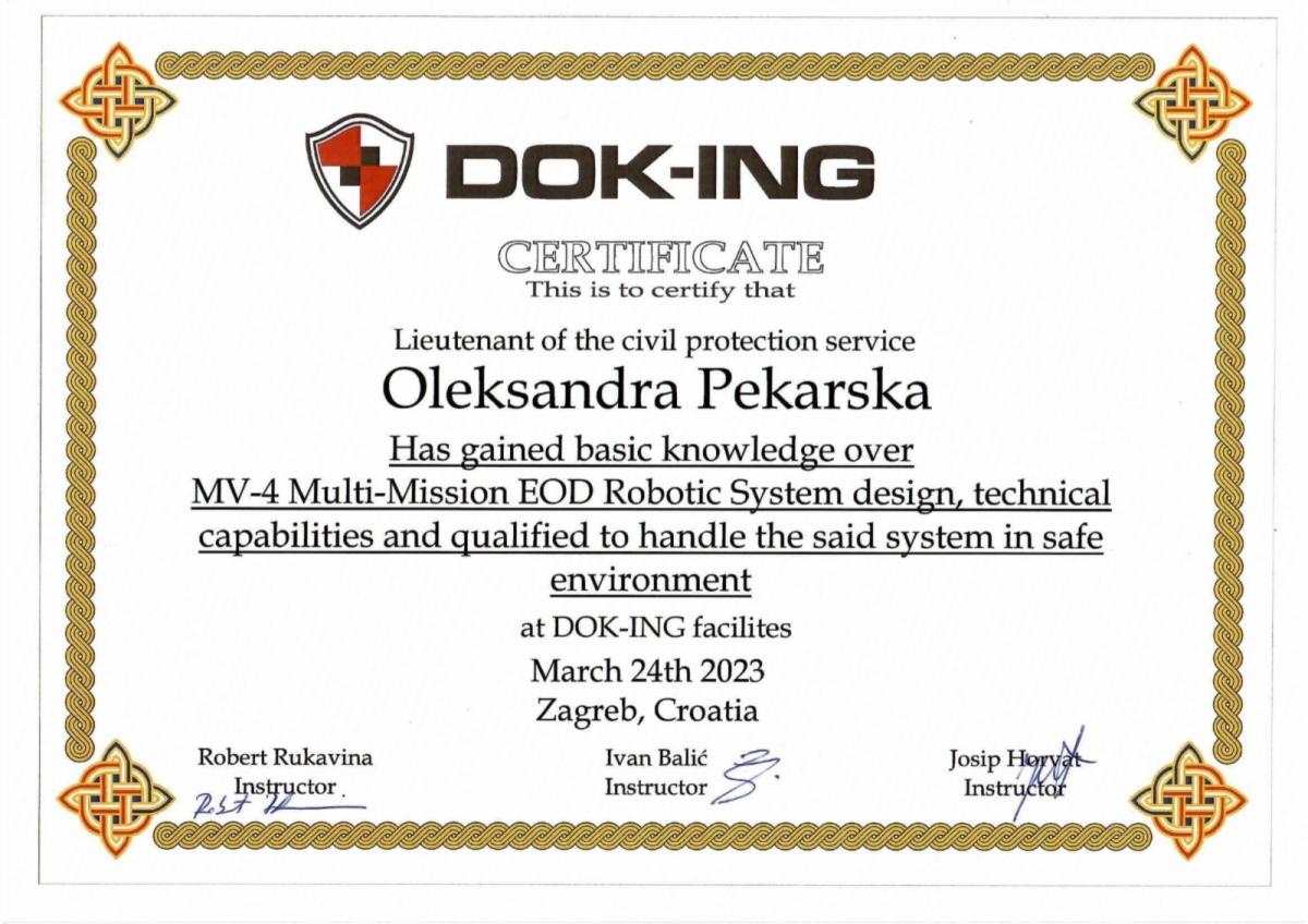 2023 р. - Отримала базові знання про конструкцію роботизованої системи MV-4 Multi-Mission EOD, технічні можливості та кваліфікацію для роботи з цією системою в безпечному середовищі на обладнанні DOK-ING;
