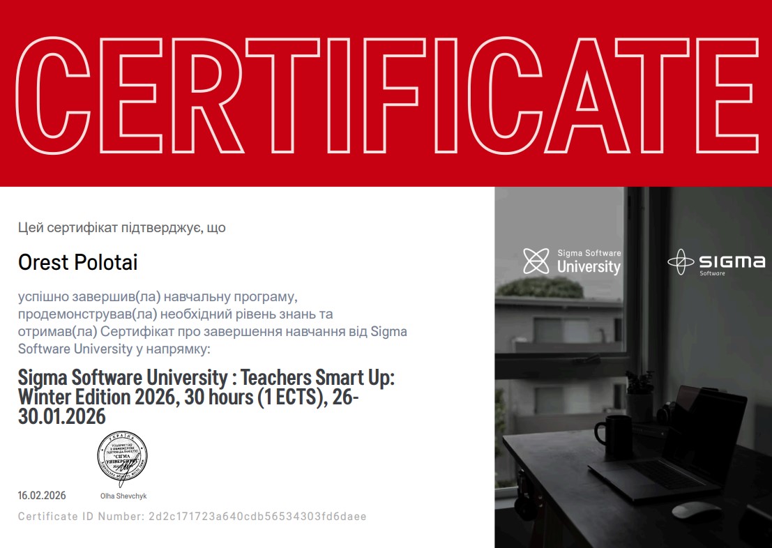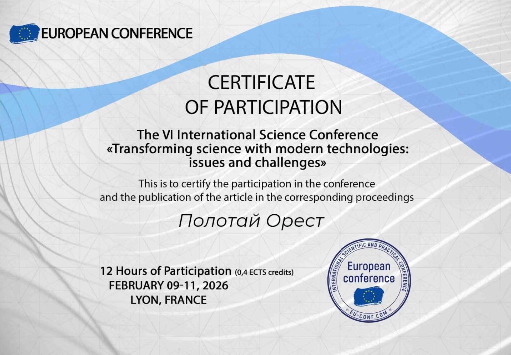 3. Полотай О.І. Прогнозування інтегрального інноваційного індикатора безпеки економічної інформації / О.І. Полотай //Безпека інформації. – 2015. – Т. 21, № 2. – С. 201-206. 4. Полотай О.І. Розробка методичних підходів з управління програмою віртуалізації вищої школи / О.І. Полотай // Вісник ЛДУ БЖД. – 2016. – Т. 14. – С. 53-60. 5. Полотай О.І. , Гриник Р.О. Застосування генетичного алгоритму для розкриття ранцевої криптосистеми Меркля-Хелмана / Полотай О.І. , Гриник Р.О. // Вісник ЛДУ БЖД. – 2016. – Т. 14. – С. 77-83. 4. Полотай О.І. , Гриник Р.О. Освітні проекти і програми в українському суспільстві: інформаційна безпека та перспективи розвитку / Полотай О.І. , Гриник Р.О.// Підприємництво і торгівля : збірник наукових праць / [редакц. кол.: Куцик П. О., Апопій В. В., Семак Б. Б. та ін.]. – Львів : Видавництво Львівського торговельно-економічного університету, 2016. – Вип. 20. – 134 с. 6. Полотай О.І. Побудова та оцінка прогнозу показників інноваційного сегменту економічної безпеки України / О.І. Полотай // Інфраструктура ринку Електронний науково-практичний журнал. Електронна сторінка видання – www.market-infr.od.ua ПУ «Причорноморський науково-дослідний інститут економіки та інновацій», 2018, Випуск 15, С. 209-215 7. Полотай О.І. Ресурс «семінар», як інструмент взаємного оцінювання учасників електронного курсу в системі MOODLE / О.І. Полотай // Вісник Львівського державного університету безпеки життєдіяльності, 2018, випуск 18; 8. Лагун А.Е., Полотай О.І. Особливості приховування інформації в зображеннях з використанням молодшого значущого біта /Лагун А.Е., Полотай О.І. // Вісник ЛДУ БЖД. – 2019. – № 20. 9. Кухарська Н., Полотай О. Аспекти інформаційної безпеки в управлінні безперервністю діяльності організацій / Кухарська Н., Полотай О. // Інформаційні технології та безпека. Київ, 2019. Т. 7, № 2. С. 126-136. " 10. Kukharska N., Lagun A., Polotai O. The steganographic approach to data protection using Arnold algorithm and the pixel-value differencing method. Proceedings of the 2020 IEEE 3rd International Conference on Data Stream Mining and Processing, DSMP 2020, 2020, pp. 174-177. 11. Polotai O., Belej O., Nestor N. Developing a local positioning algorithm based on the identification of objects in a Wi-Fi Network of the Mall. International Conference on Perspective Technologies and Methods in MEMS Designthis. 2019. Article ID 8817385. P. 32–36. 12. Polotai O., Belej O., Nestor N., Sadeckii J. Features of Application of Data Transmission Protocols in Wireless Networks of Sensors. 2019 3rd International Conference on Advanced Information and Communications Technologies, AICT 2019. Proceedings. 2019. Article ID 8847878. P. 317–322. 13. Лагун А.Е., Полотай О.І. Особливості приховування інформації в зображеннях з використанням молодшого значущого біта. Вісник ЛДУБЖД : зб. наук. праць. Львів : ЛДУБЖД, 2019. № 20. С. 17–22. 14. Кухарська Н.П., Полотай О.І. Аспекти інформаційної безпеки в управлінні безперервністю діяльності організації. Information Technology and Security. July-December 2019. Vol. 7. Issue. 2 (13). P. 126-136. 15. Polotai O., Kukharska N., Samotyy V., Lagun A.Trend extrapolation method for qualitative prognosis the global cybersecurity index in Ukraine. ISTCMTM. 2020. Vol. 81 (4). P. 30–34. 16. Belej O., Kolesnyk K., Polotai O.,Application of neural networks in intrusion monitoring system for wireless sensor networks. Conference on Computer Science and Information Technologies. CSIT 2020: Advances in Intelligent Systems and Computing. 2020. Vol. 1293. Springer, Cham. P. 1101–1115. 17. Полотай О.І., Белей О.І., Мальцева Н. Фізичний зміст комп’ютерної стеганографії. Вісник ЛДУБЖД : зб. наук. праць. Львів : ЛДУБЖД, 2021. № 23. С. 27–32. 18. Полотай О.І. Побудова прогнозу сукупного інноваційного показника інформаційної безпеки соціально-економічної сфери. Вісник ЛДУБЖД : зб. наук. праць. Львів : ЛДУБЖД, 2023. № 27. С. 60–66. 19. Полотай О.І. Використання комп’ютерної криміналістики для забезпечення ефективного розслідування інцидентів інформаційної та кібербезпеки. Вісник ЛДУ